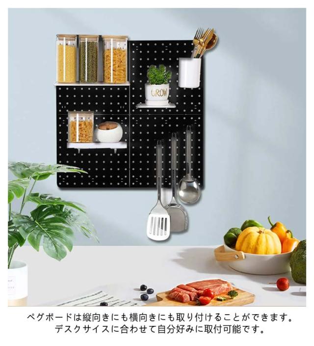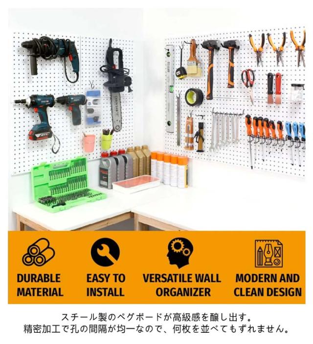 | シンプルで使いやすいスチール製の有孔ボードです。 デスク上に散乱している物をペグボードに載せてデスク広々、生産性向上、お洒落で快適なデスク環境になります! スチール製のペグボードが高級感を醸し出す。精密加工で孔の間隔が均一なので、何枚を並べてもずれません。 ペグボードは縦向きにも横向きにも取り付けることができます。デスクサイスに合わせて自分好みに取付可能です。 ついつい色んな物が貼ってあってごちゃごちゃし安い、冷蔵庫ドア前の整理整頓にもおすすめです。 玄関に置いて車のやお家のカギをかけて置くとお出かけの時に探す必要なく、すぐでられます。 女性の方1人でも簡単に設置しやすいと評判を頂いています。 | |