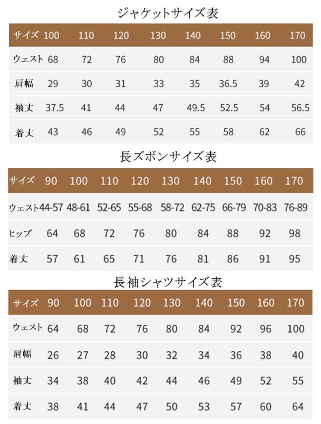 | サイズについての説明 | 4点セット内容:ジャケット+長ズボン+シャツ+リボンタイ |