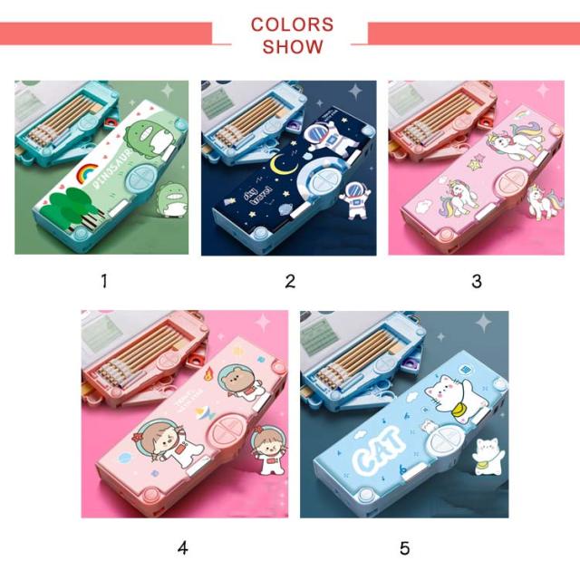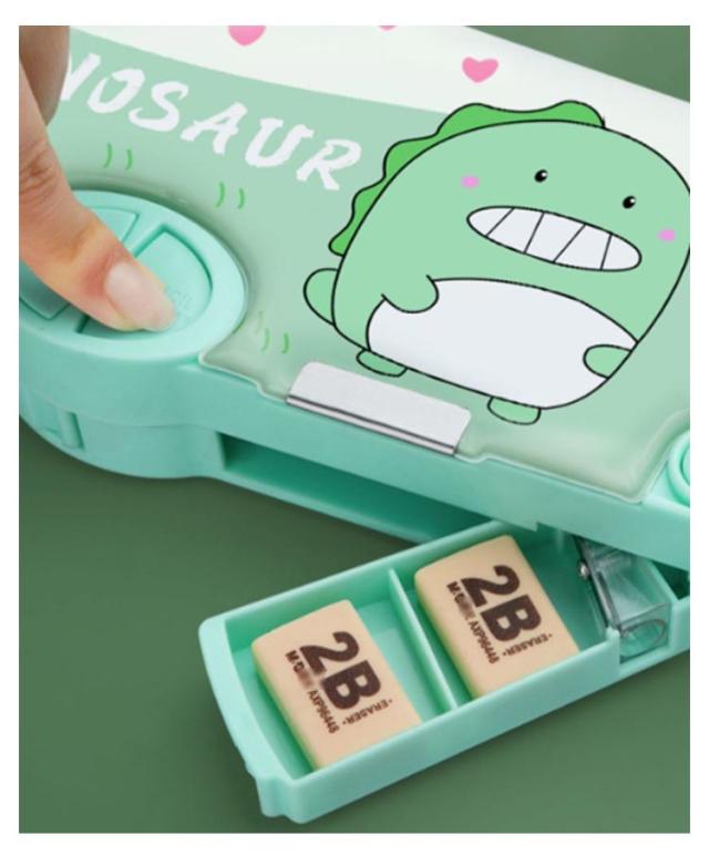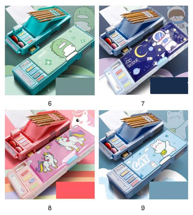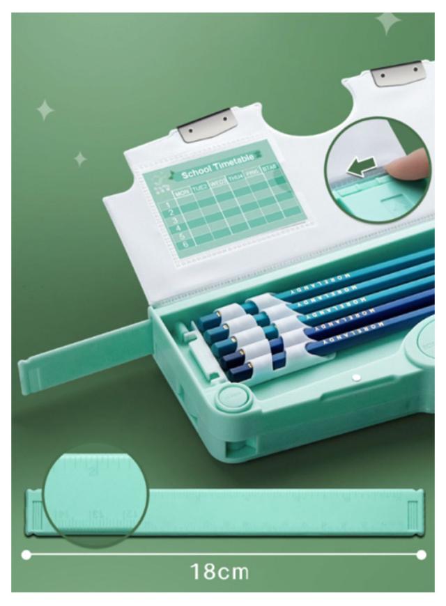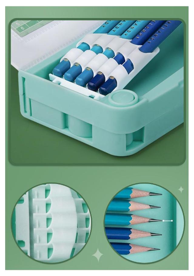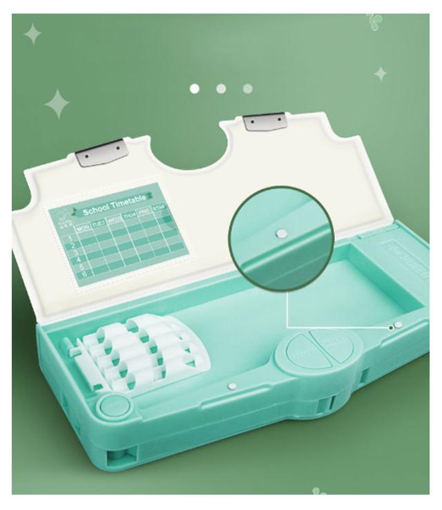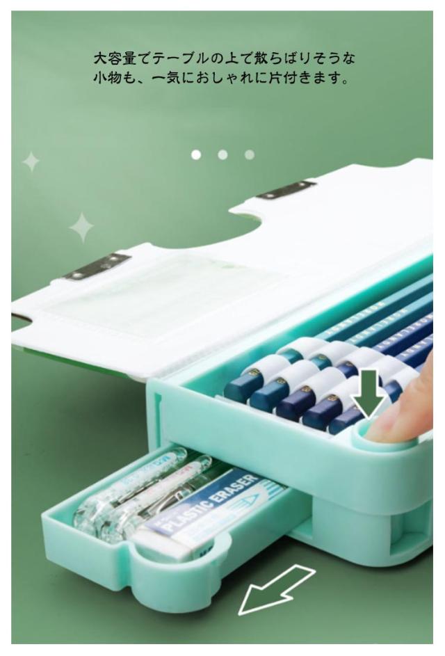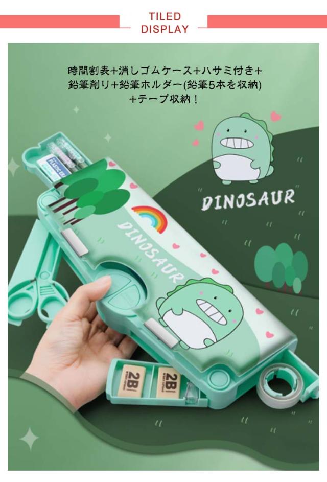 | 多機能・大容量な筆箱。 時間割表+消しゴムケース+ハサミ付き+鉛筆削り+鉛筆ホルダー(鉛筆5本を収納)+テープ収納! 大容量でテーブルの上で散らばりそうな小物も、一気におしゃれに片付きます。 文房具が一目瞭然で、分かりやすく使いやすい! | |