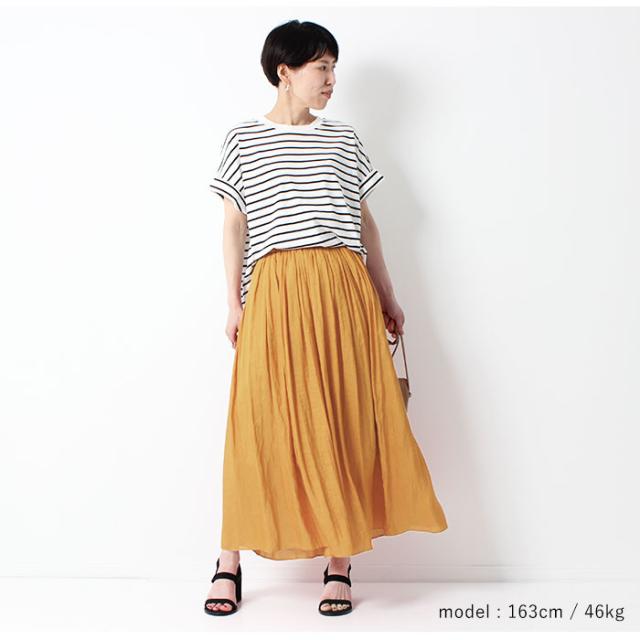 | 滑らかな手触りのとろみ生地を使った上品で、贅沢なスカート。 ナチュラルなシワ感に軽やかな素材を使用し、広がり過ぎないシルエットに。 くしゅっとしたナチュラルなシワ感と、軽やかな素材で透け感があり さらりとした触り心地です。 ウェストは総ゴムで楽な履き心地に、落ち感のある縦ラインがすっきりと見せます。 カジュアルにもきれいめにも使えるビンテージギャザースカートです。 |