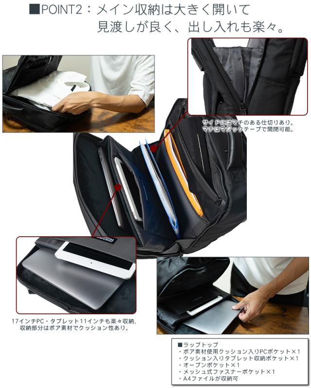 ■ビジネスシーンで必要な様々なモノをしっかりと収納できる設計。
