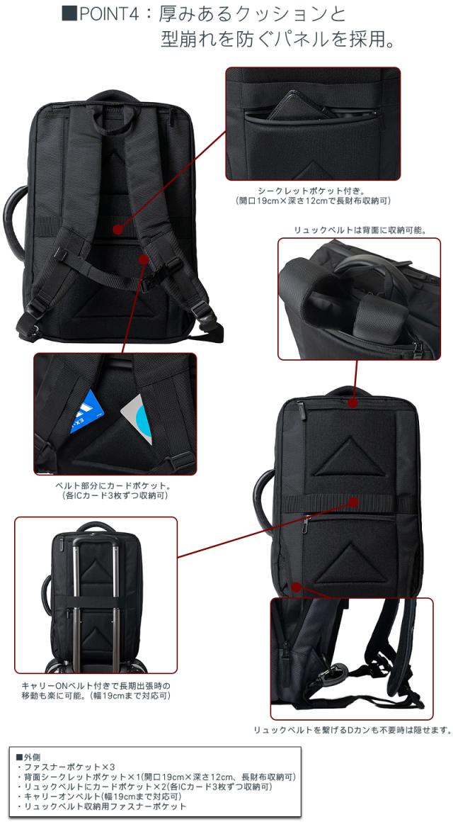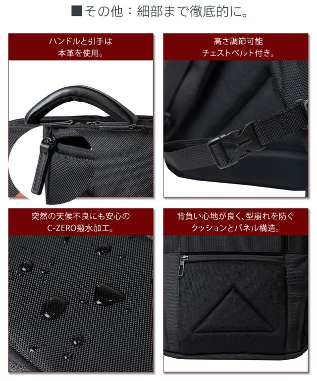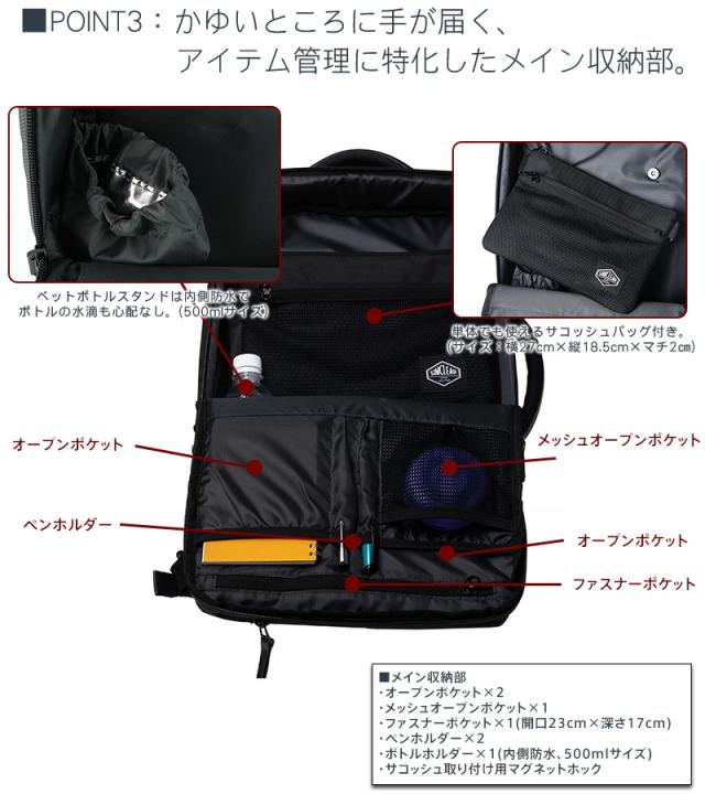 | 備考 | 【メイン開閉】ダブルファスナー 外側/ ・ファスナーポケット×3 ・背面シークレットポケット×1(開口19cm×深さ12cm、長財布収納可) ・リュックベルトにカードポケット×2(各ICカード3枚ずつ収納可) ・キャリーオンベルト(幅19cmまで対応可) ・リュックベルト収納用ファスナーポケット 内側/ ・オープンポケット×2 ・メッシュオープンポケット×1 ・ファスナーポケット×1(開口23cm×深さ17cm) ・ペンホルダー×2 ・ボトルホルダー×1(内側防水、500mlサイズ) ・サコッシュ取り付け用マグネットホック ラップトップ/ A4ファイル収納可 ・ボア素材使用クッション入りPCポケット×1 ・クッション入りタブレット収納ポケット×1・オープンポケット×1 ・メッシュファスナーポケット×1 ■サイドのマジックテープを外してフルオープン可能 サコッシュ/ 本体内部に取り付け可能 ・着脱可能なショルダーストラップ×1(ベルトを付けたまま収納可) ・メッシュファスナーポケット×1 ・マグネットホックポケット×1 キーワード: 20代 30代 40代 50代 就職祝い 出張 機内持ち込み可能サイズ 仕事用 多機能 キャリーオン 黒 人気 トレンド 無地 カジュアル フォーマル 手提げバッグ ビジネスバッグ 大容量 20l 営業 IT 動きやすい 軽量 軽い サコッシュ サブバッグ付き プレゼント ギフト ラッピング ラッピング無料 メンズ レディース 男性 女性 通勤 通学 ビジネス 学生 ブランド ポイント消化 ニューバッグワカマツ ニューバックワカマツ | ||