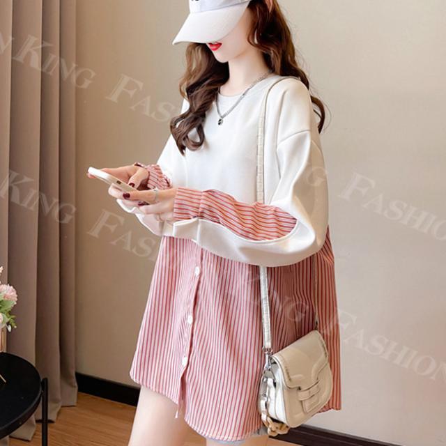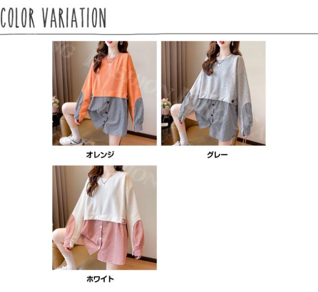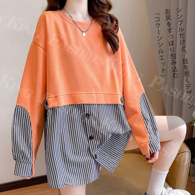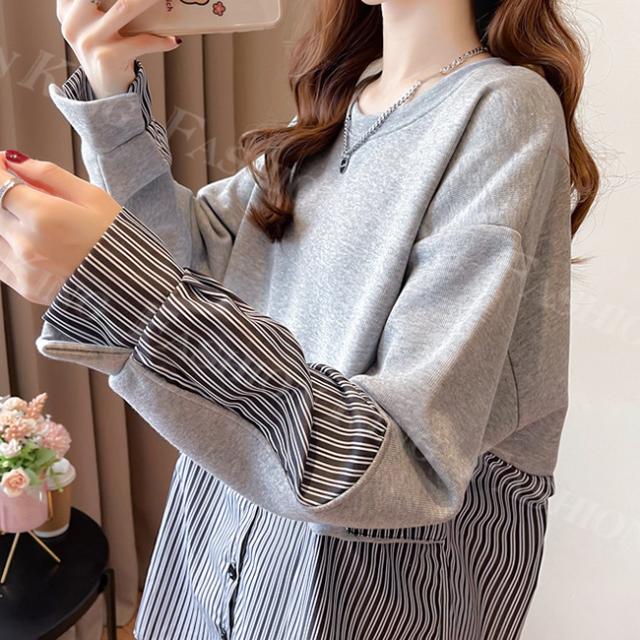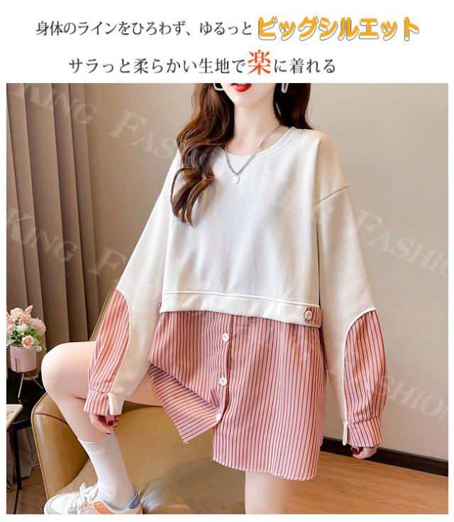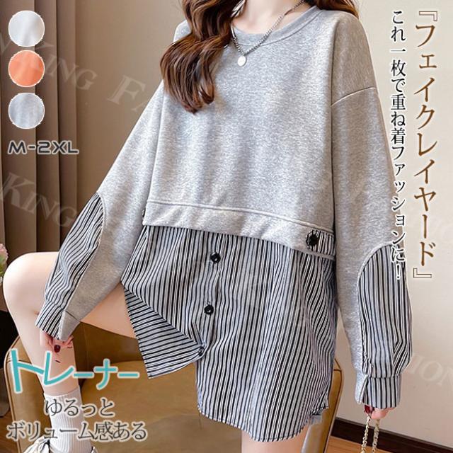 トレーナー トップス レディース 秋冬 春新作 プルオーバー フェイクレイヤード ゆったり 肩落ち 重ね着風 スウェット クルーネック 大きいサイズ 体型カバー カットソー パーカー ホワイトデー 卒業式
