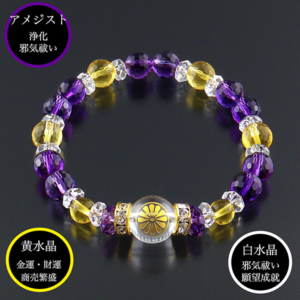 繁栄の菊ブレス‐BL_1680 菊 ブレスレット パープル イエロー アメジスト 白水晶 黄水晶 長寿祈願 厄除け 無病息災 レディース メンズ パワーストーン