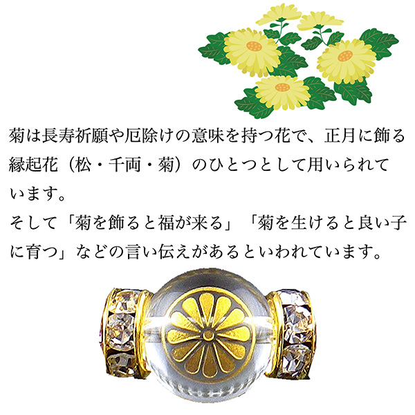 菊は長寿祈願や厄除けの意味を持つ花で、正月に飾る縁起花(松・千両・菊)のひとつとして用いられています。そして「菊を飾ると福が来る」「菊を生けると良い子に育つ」などの言い伝えがあるといわれています。他にも無病息災や不老長寿を願う神事「重陽の節句」も菊を用いて行うことから「菊の節句」と呼ばれています。このように菊は古来より縁起の良い花として親しまれてきました。