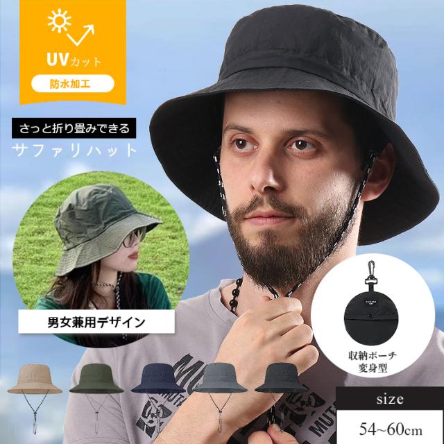 帽子 メンズ 夏用 ハット サファリハット コンパクト つば広 あご紐 折りたたみ 収納ポーチ 日よけ 日除け 釣り ゴルフ 農作業 キャンプ 登山 おしゃれ シンプル UVカット 紫外線 熱中症対策 アウトドア 男女兼用
