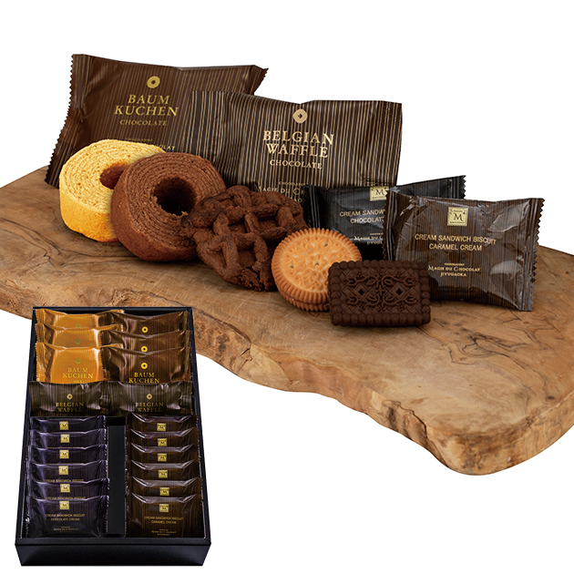 ●ベルギーワッフル(ショコラ)×2個、バームクーヘン(ショコラ・ミルク)×各3個、クリームサンドビスケット(ショコラ・キャラメル)×各6個