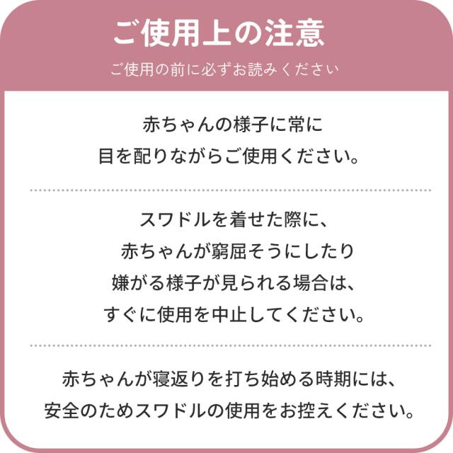 ・スワドルを着せた際に、赤ちゃんが窮屈そうにしたり嫌がる様子が見られる場合は、すぐに使用を中止してください。