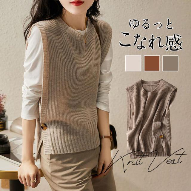【水曜日まで!10%クーポン配布中】 ニットベスト クルーネック レディース プルオーバー 秋服 秋冬 チョッキ 重ね着 着痩せ ノースリーブ レイヤード カジュアル 秋コーデ 細身 サイドボタン