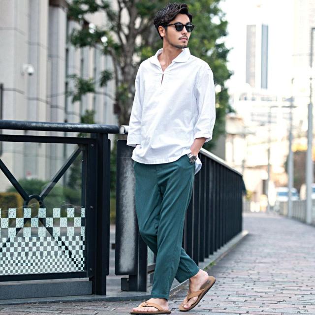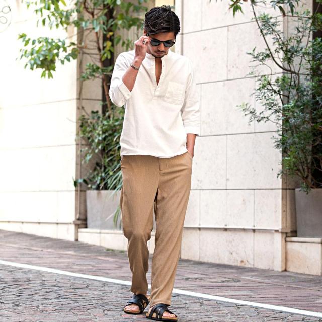足元はサンダルで季節感を出し、シンプルなTシャツやシャツを合わせるだけで大人のヌケ感あるコーデを楽しむことが出来ます。
