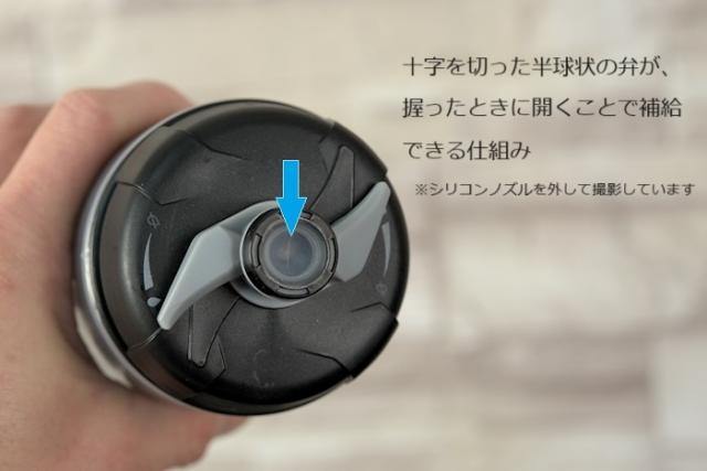 ・ノズル内蔵の弁が握ったときにのみ開くので、さかさまにしても漏れません。
