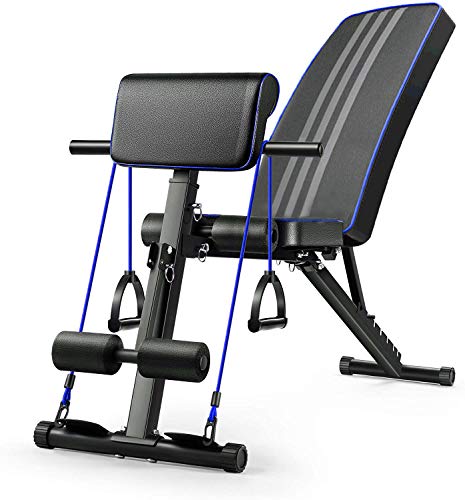 ?【角度調整可能】:一秒で角度調整可能!バックシート7段階、シートクッション4段階、レッグカール2段階!コンパクトなデザインで、鍛えたい部位やメニューに合わせて自由に変更することができます。?【独自の追加機能】7段階調節可能なフロントパッド、アームカールベンチとして使用できる。2本の エクササイズバンド付きで、様々なトレ一ニングに使えてパリエ一ションが広がる。