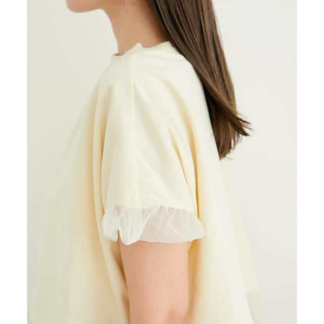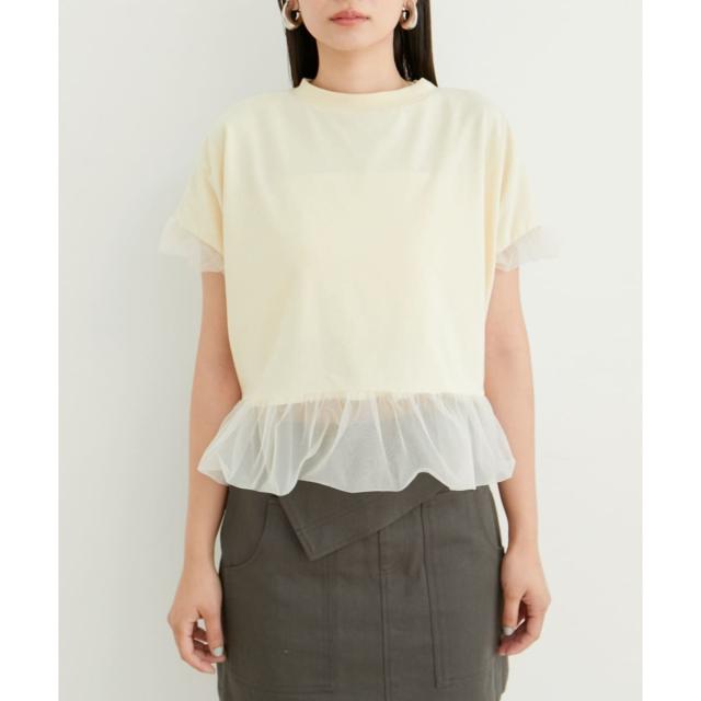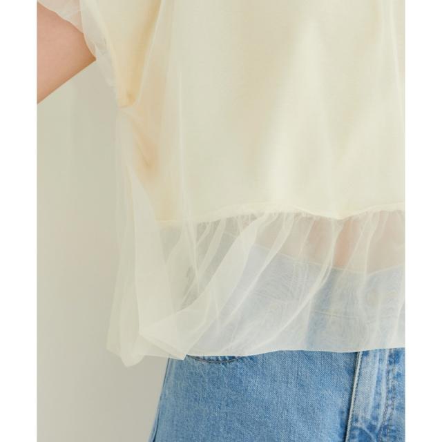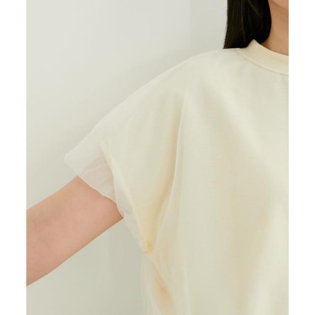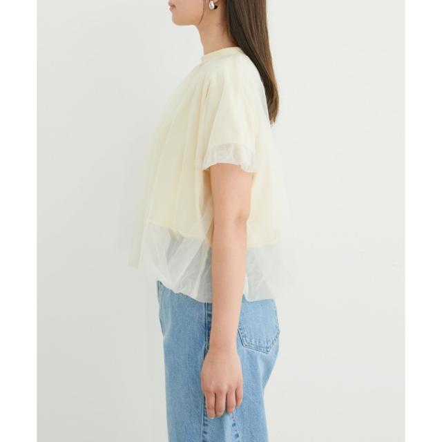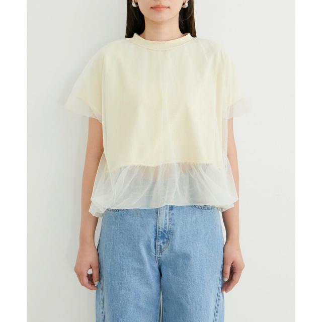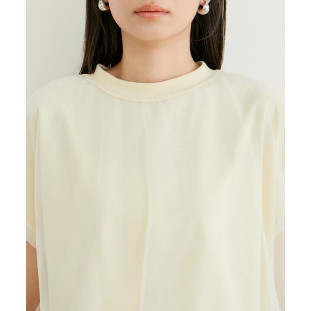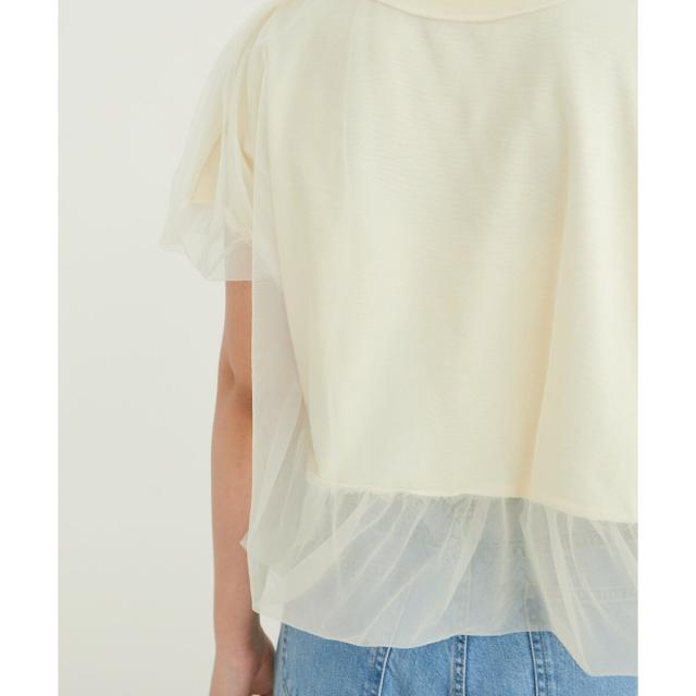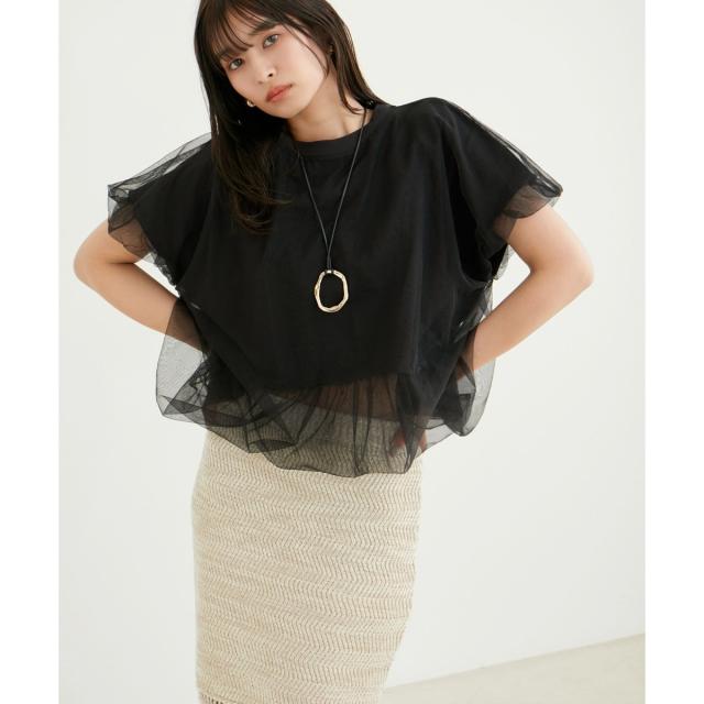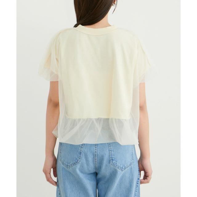 チュールとTシャツがドッキングされ、表裏2WAYで着まわせるトップス。トレンドのチュールと使いやすいカットソーが合わさって甘さとカジュアルさがMIXされたデザイン。またボクシーでフレア感もあるシルエットと程よい丈感が着回しやすさ抜群です。