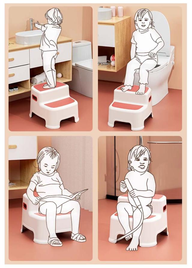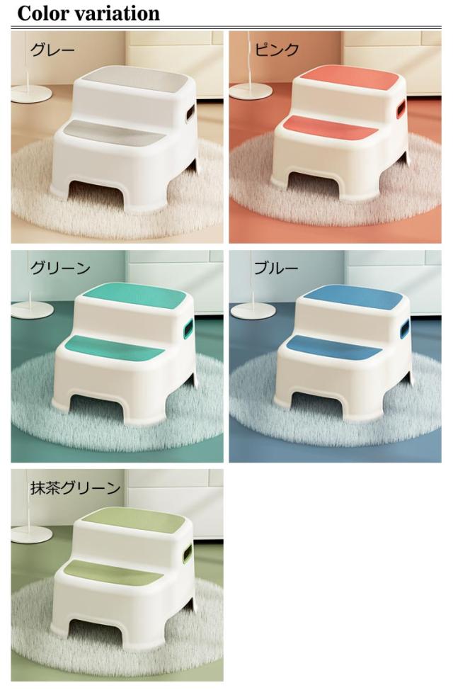 | 洗面所、キッチン、トイレなど、お子様が背の届きにくい場面で使用できる、2段仕様の踏み台です。 自立心が芽生えてきたお子様の、自分でやりたい気持ちを育て、「できた!」という自信につなげてくれます。 2段あるから、お子様も登りやすく、洗面所でも手が届きやすい高さに。 お子様が立つところや、床への接地面全てに滑り止めが付いているので、滑りにくく安定感があります。 持ち運びやすい取っ手付きで、軽いから移動もらくらく! | |