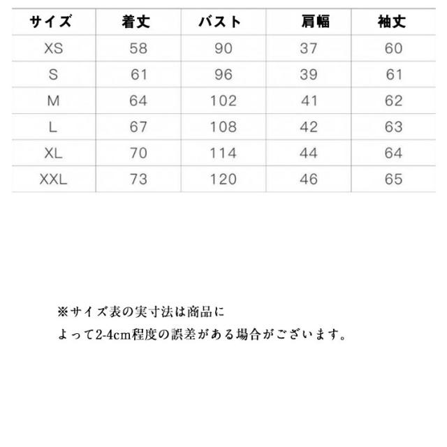 | サイズについての説明 | サイズ 着丈 バスト 肩幅 袖丈 ※サイズ表の実寸法は商品によって2-4cm程度の誤差がある場合がございます。 |