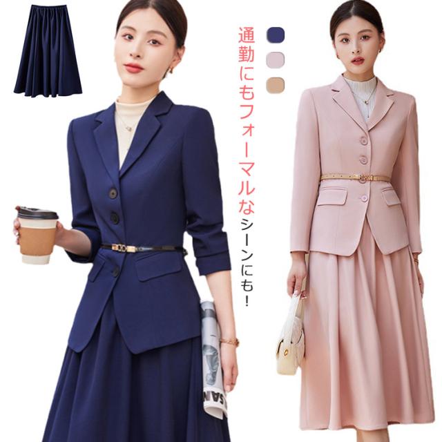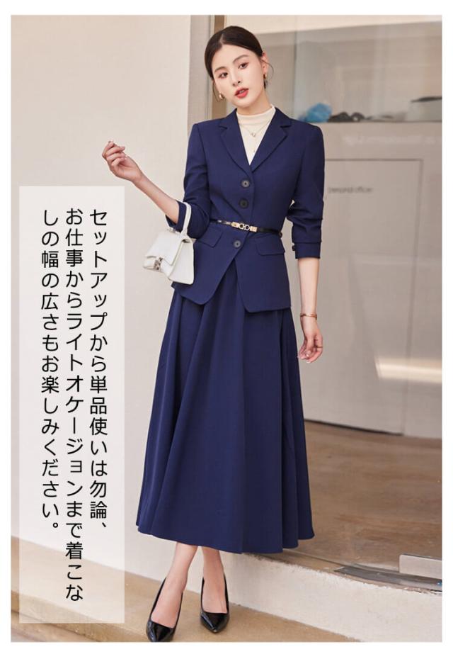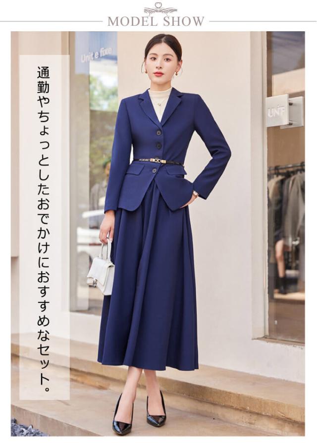 フォーマルスーツ ママスーツ スーツ ロング丈 レディース 上下セット セットアップ アンサンブルスーツ フォーマルスーツ ビジネススーツ フレアスカート 長袖 スカートスーツ 体型カバー ロングジャケット フェミニン オフィス 通勤 夏 春