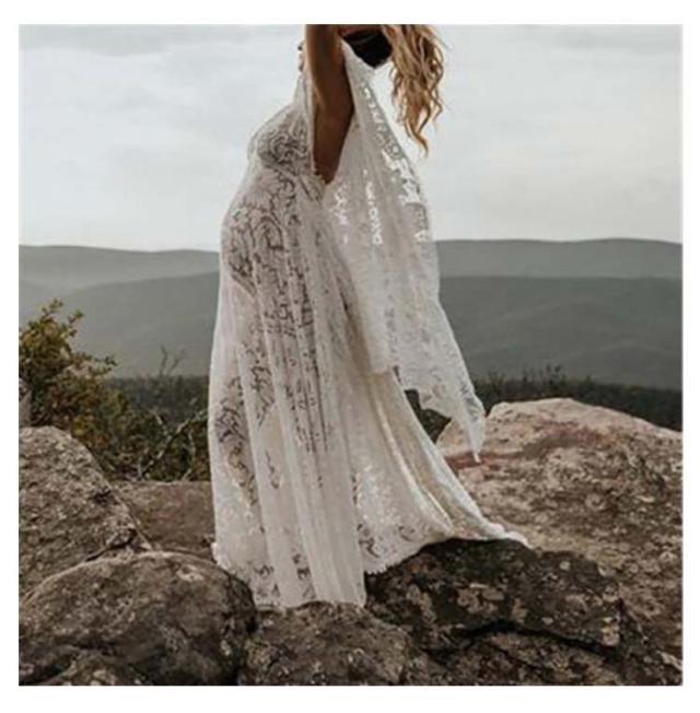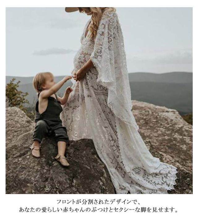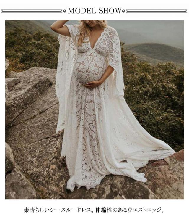 記念写真 大人気!マタニティ フローラルス Vネック 写真撮影 長袖 可愛い ホワイト 送料無料 フロント マキシフローラルガウン レースドレス プリット フォト 衣装 妊娠中 上品 きれい 快適 写真のスカート