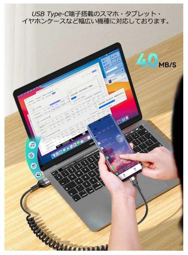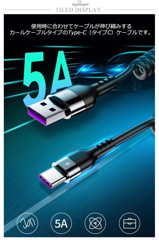 | 【2本組 / 最長1.8m】 【カールタイプ・USB Type-Cケーブル】 使用時に合わせてケーブルが伸び縮みするカールケーブルタイプのType-C(タイプC)ケーブルです。 未使用時、コンパクトに収納可能です。 太い錫メッキ無酸素銅コアを採用しており、電流のロスを低減しているため、転送スピードが速いです。 最大5Aの電流で接続デバイスへ高速充電することが可能です。 スマートチップを搭載しているので、接続デバイスの電流をスマートに一致させ、電圧を定常させ、同時に安全保護を行います。 高純度なアルミ合金外装を採用し、耐指紋・耐摩耗性・速い放熱性・堅牢軽量などの特性を持ちます。 厳しい折り曲げ試験に耐えているので、ケーブルの柔軟性は高く、耐屈曲性が強いです。 USB Type-C端子搭載のスマホ・タブレット・イヤホンケースなど幅広い機種に対応しております。 | |