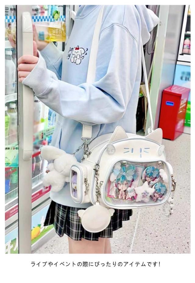 | かわいい猫型の痛バッグ。 クリア部分にはお気に入りの写真や缶バッジなどを入れられる遊び心あるひと品! 両サイドにはポケットがあるため、なくしやすいリップなどの小物収納におすすめ。 缶バッジや写真、キーホルダーやぬいぐるみなど、かわいくデコしてオリジナルの“痛バッグ”が作れます。 ライブやイベントの際にぴったりのアイテムです! | |