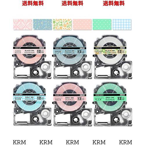 【テープセット】: テプラ ガーリー テープ 12mm SWM12PH SWM12GH SWX12BH SBM12P SBM12B SBM12D の互換品、6個セット。【色】: ダマスク(ピンク)、スター(ブルー)ボタニカル(オレンジ)+ 黒文字(各長さ5m)、水玉ピンク チェック青 水玉緑 + グレー文字(各長さ8m)。