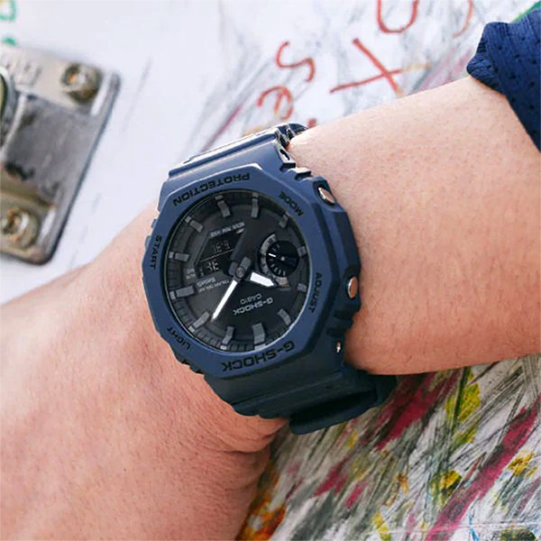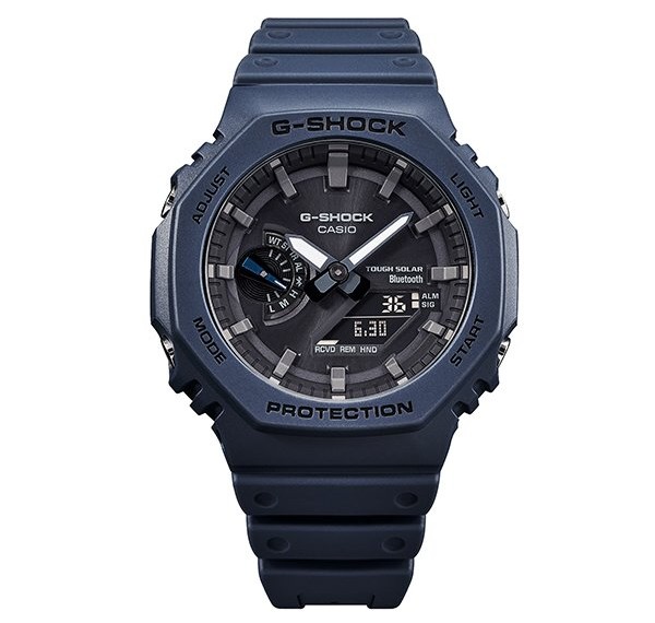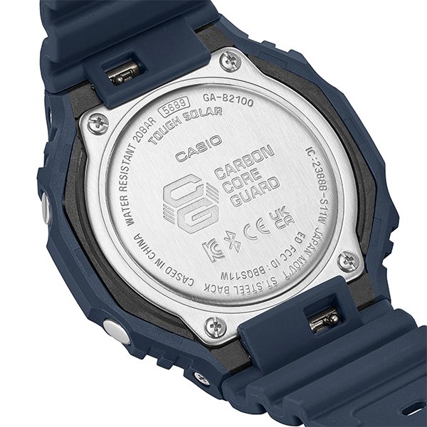 初代G-SHOCKのデザインコンセプトを受け継いだGA-2100の八角形フォルムはそのままに、スマートフォンリンクとタフソーラーを搭載しました。高機能化に伴う部品点数の増加に対応するため、基板配置を最適化した薄型モジュールを新しく開発。カーボンコアガード構造と組み合わせることで、従来モデルのサイズ感をキープしています。ケース・バンドのカラーは、5600シリーズに初採用された“ファーストカラー”のブルーを復刻しました。