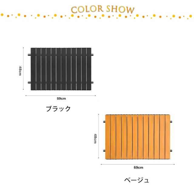 | 付属のフック(幅1.5cmの角型フレームにに対応)をキャリーワゴン前後のフレームにはめ込み、 ポールをフックに固定してから、パタパタ天板を開いてキャリーワゴンに乗せれば、 おしゃれで便利なテーブルに大変身。 持ち運びに便利な収納袋も付属するので持ち運びや保管に便利。 キャンプはもちろん、運動会やお花見、ピクニックに。使いたいときにサッとキャリーワゴンがテーブルに早変わり。 | |