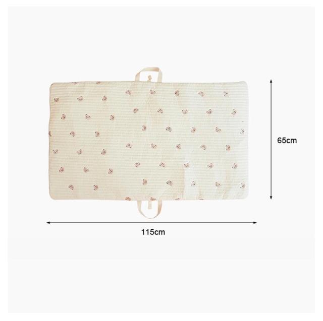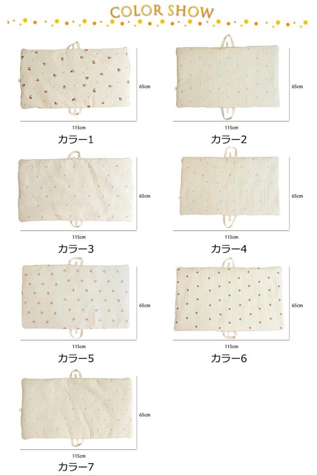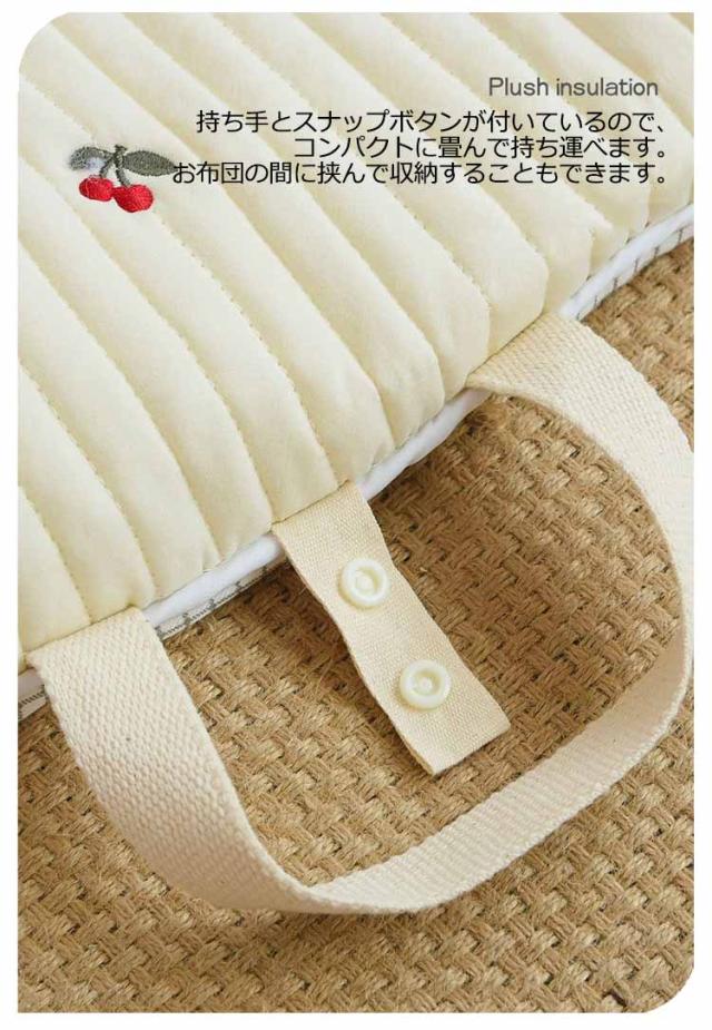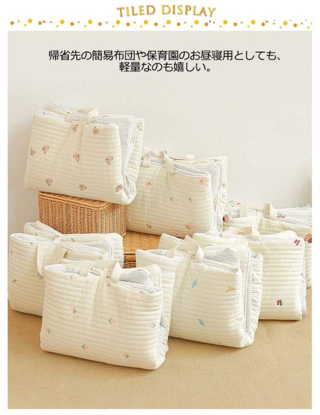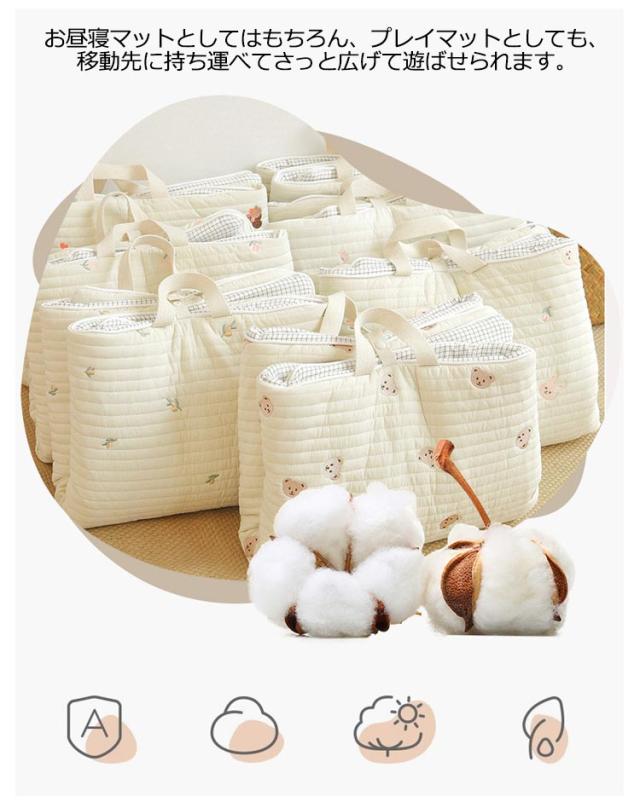 | 癒され、かわいい刺繍デザイン!赤ちゃんのお肌にやさしく、ふわふわなさわり心地のお昼寝マット。 持ち手とスナップボタンが付いているので、コンパクトに畳んで持ち運べます。お布団の間に挟んで収納することもできます。 帰省先の簡易布団や保育園のお昼寝用としても、軽量なのも嬉しい。 お昼寝マットとしてはもちろん、プレイマットとしても、移動先に持ち運べてさっと広げて遊ばせられます。 | |