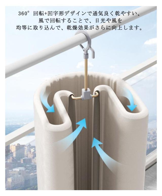 | 幅最大2.4mまでの大物へ!完全密閉式シーツハンガー2個組 折りたたみ式 360°回転防風フックれる心配なし! 完全密閉式なので、一般的なS型などオープンタイプのハンガーよりも型崩れしにくい。 使用されているAL-Mg-Sシリーズ合金は、高耐食性、高耐酸化性、塗装容易性、良好な加工性、耐熱性、耐摩耗性を備えた航空グレードの材料です。 そのため、雨の日の屋外に置いてもサビで洗濯物を汚す心配がありません。 360°回転+凹字形デザインで通気良く乾やすい、風で回転することで、日光や風を均等に取り込んで、乾燥効果がさらに向上します。 シーツや掛け布団カバー、毛布など幅は最大2.4mまでの大物も干せます。 セミダブルのシーツもベッドカバーや布団シーツバスタオルも2~3枚まで洗濯可能。 使わないときには畳んでおけるので、収納も省スペースです。 | |