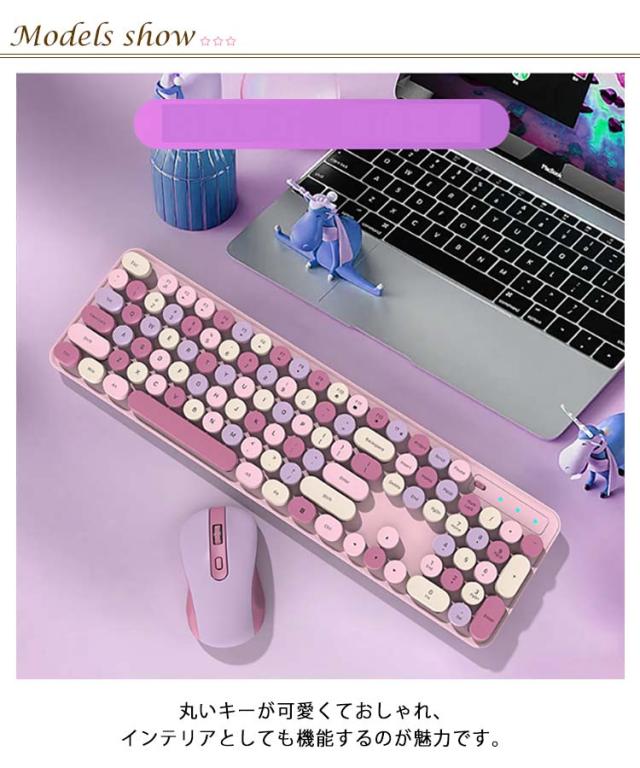 | レトロなタイプライター風のキーボード・マウスセット♪ 丸いキーが可愛くておしゃれ、インテリアとしても機能するのが魅力です。 普通のキーボードと同じくテンキー付属で、仕事やゲームが満足できます。 姿勢に合わせて傾斜角スタンド付きで、作業しやすい。 付属のレシーバーは1個でキーボードとマウス両方に接続できます。 2.4GHzワイヤレステクノロジーにより、近周波数の電波が多く存在する環境でも、遅延やデータ欠落、干渉のない、安定した通信で快適に操作出来ます。 電源ボタン付きで、使用しない時はOFFにして、省エネ。 | |