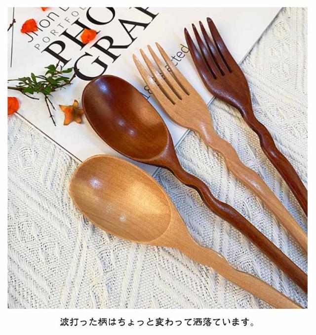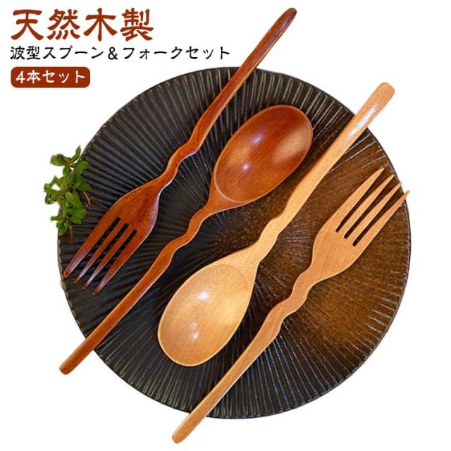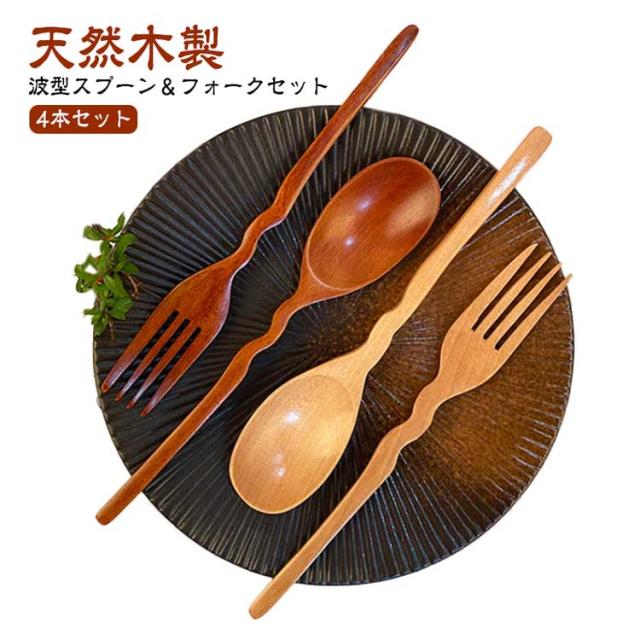木製 波型 スプーン フォーク 4本セット 天然木製 デザートスプーン カレースプーン パスタ フォーク セット おしゃれ かわいい 天然木 ナチュラル 漆塗り 韓国 カトラリー ギフト 引っ越し祝い 結婚祝い 一人暮らし かわいい ギフト