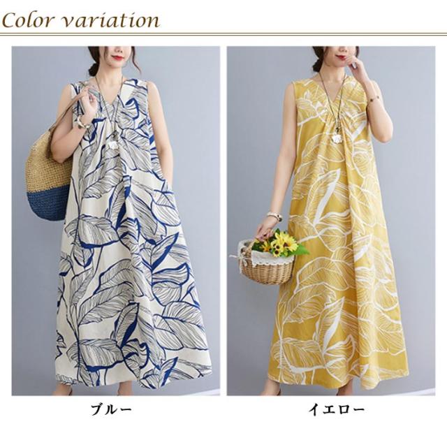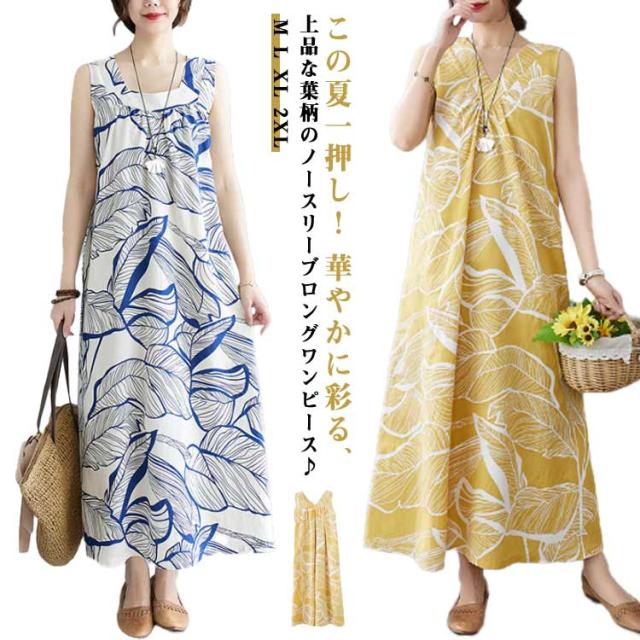 春ワンピース リゾートワンピ ノースリーブ Vネック ハワイアン おしゃれ ロングワンピース ワンピース マキシ丈 ゆるワンピース リゾートワンピース ワンピース ビーチ 可愛い 体型カバー 大きいサイズ 送料無料 イエロー