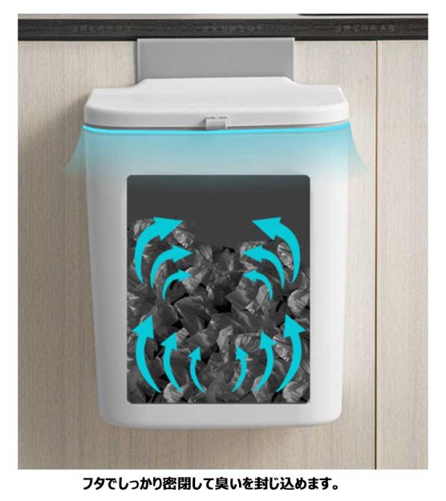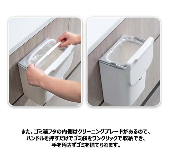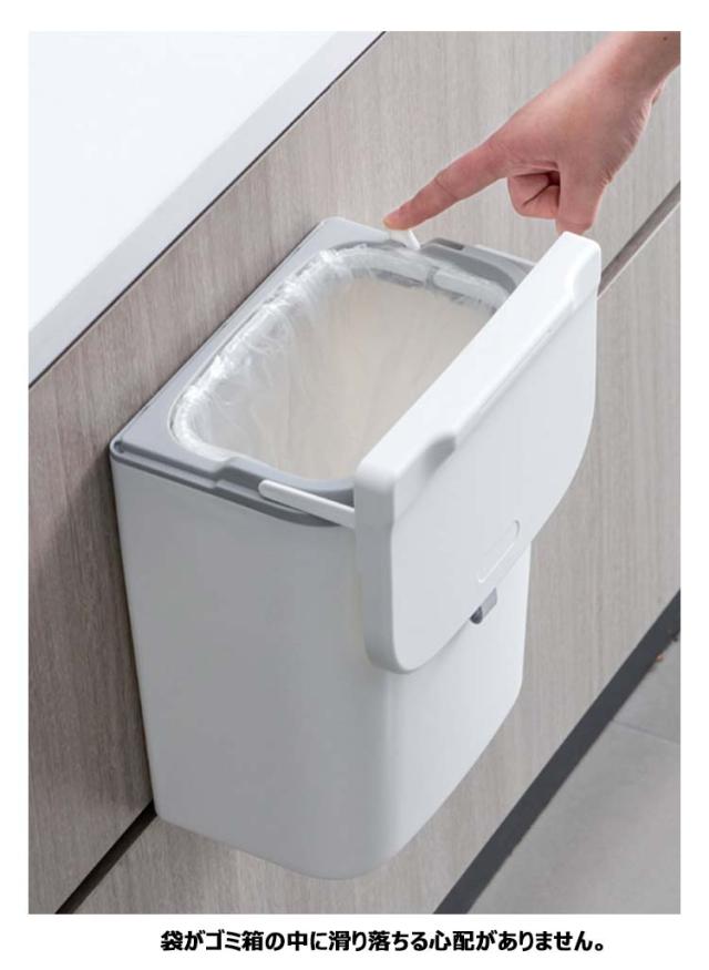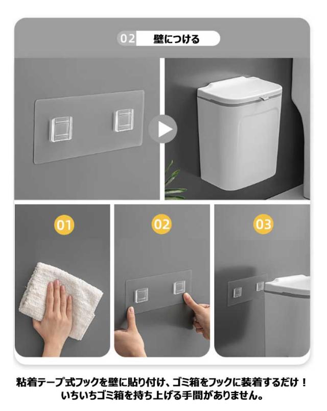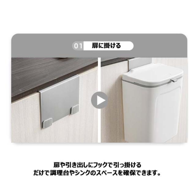 | ●3WAYの使い方 ・扉に掛ける 扉や引き出しにフックで引っ掛けるだけで調理台やシンクのスペースを確保できます。扉の厚さ2.3cm以内の全扉に対応します。 ・壁につける 粘着テープ式フックを壁に貼り付け、ゴミ箱をフックに装着するだけ!いちいちゴミ箱を持ち上げる手間がありません。 ・また、直接台所に置いてもいいし、客室、トイレ、浴室、オフィスなどに置いても適しています。シンプルなデザインで、どんな部屋でも馴染みます。 ●2WAYの開け方 使い方に合わせて、スライド式・ふた式で開け方を変えることが出来ます。 スライド式は、蓋が邪魔になることなく、広い口でごみをしっかり受け入れます。 フタでしっかり密閉して臭いを封じ込めます。 ●捨てやすい広口 投入口が大きいので、調理時に出たゴミを捨てるときなどにも役立ちます。 ●ゴミ袋固定用リング 袋がゴミ箱の中に滑り落ちる心配がありません。また、ゴミ箱フタの内側はクリーニングブレードがあるので、ハンドルを押すだけでゴミ袋をワンクリックで収納でき、手を汚さずゴミを捨てられます。 | |
