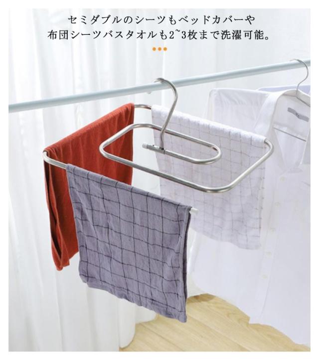 | クリップ6個付き 折りたたみ式シーツハンガー3個セット 防風フックデザインで強風でも安心! クリップ付き&防風フックがあるから外干しでも飛ばされる心配なし。 サビにくく丈夫で長持ちステンレス製。 洗濯物を傷つけないキャップ付きで安心。 四角タイプで風で回転することで、日光や風を均等に取り込んで、乾燥効果がさらに向上します。 シーツや掛け布団カバー、毛布など幅は最大2.4mまでの大物も干せます。 セミダブルのシーツもベッドカバーや布団シーツバスタオルも2~3枚まで洗濯可能。 使わないときには畳んでおけるので、収納も省スペースです。 | |