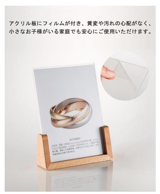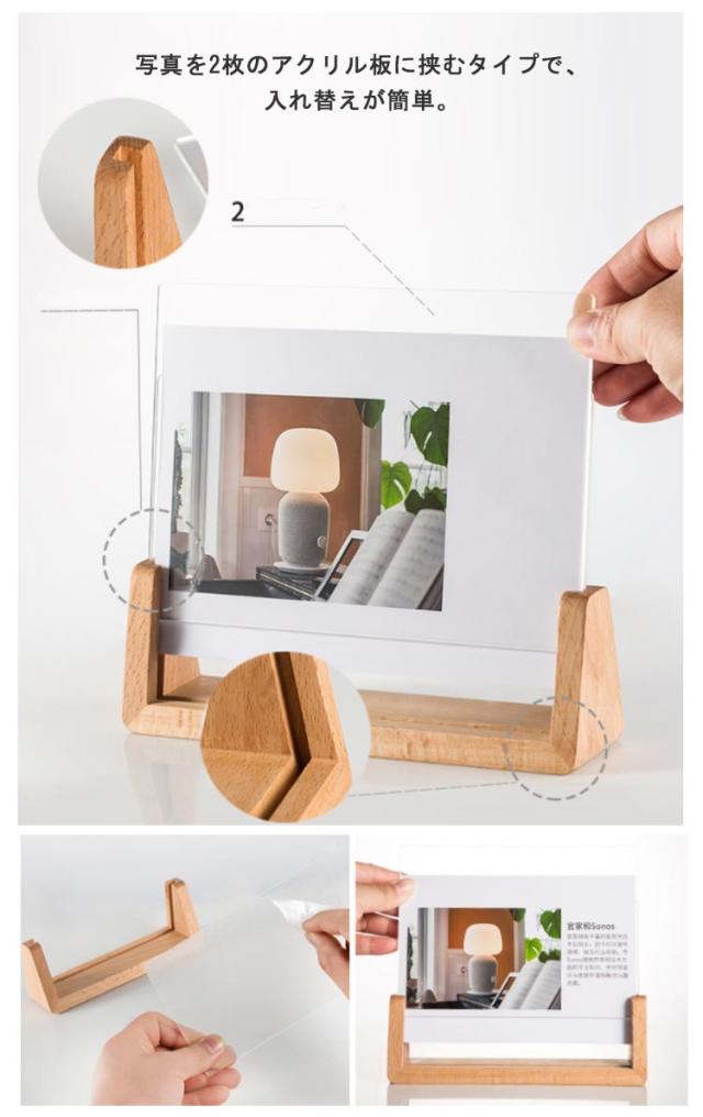 | 天然木ベースに透明のアクリル板が差し込んである写真立て。 天然木の質感が柔らかで美しく透明度の高いアクリルとあいまって洗練された印象のフォトフレームです。 写真を2枚のアクリル板に挟むタイプで、入れ替えが簡単。 アクリル板にフィルムが付き、黄変や汚れの心配がなく、小さなお子様がいる家庭でも安心にご使用いただけます。 安定感抜群で自立できるから、デスクトップスやリビングや玄関、ベッドサイドテーブルなど様々な場所で使うことができます。 写真やポストカードを飾ることで、その空間に温かみや個性を加えることができます。 | |