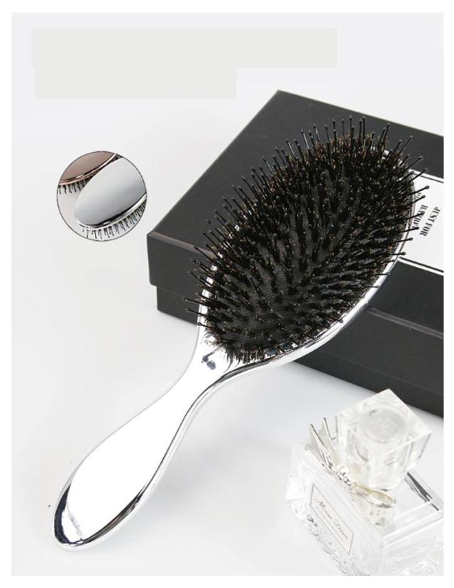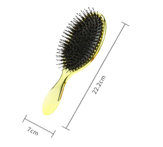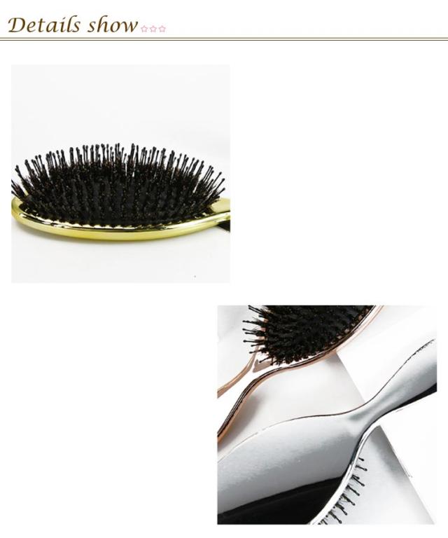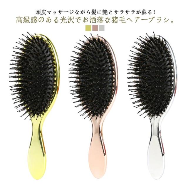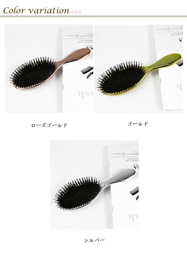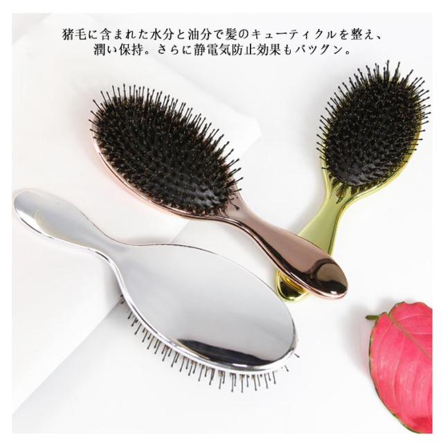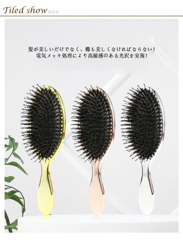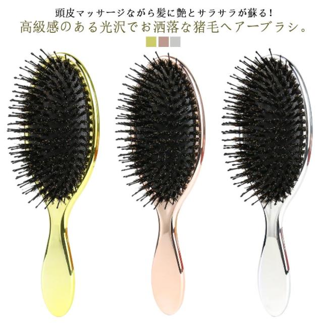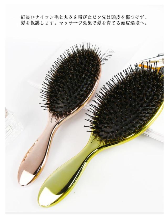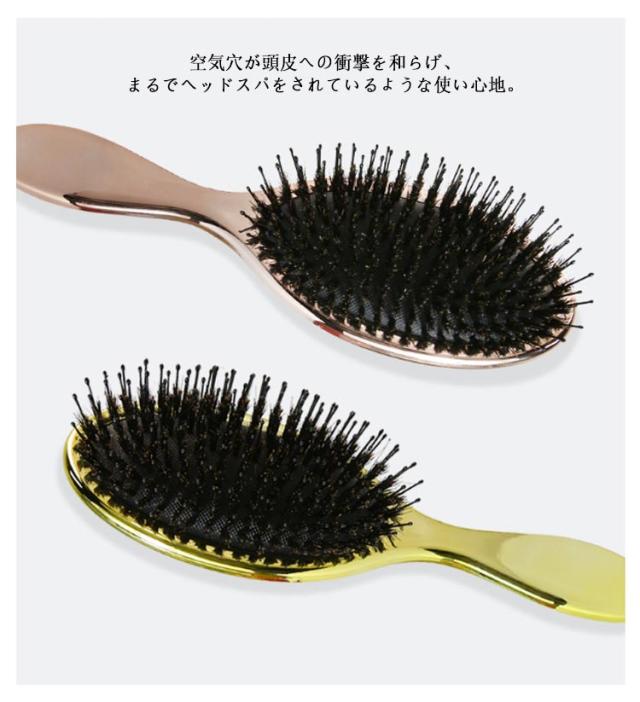 | 頭皮マッサージながら髪に艶とサラサラが蘇る! 高級感のある光沢でお洒落な猪毛ヘアーブラシ。 髪が美しいだけでなく、櫛も美しくなければならない!電気メッキ処理により高級感のある光沢を実現! 猪毛に含まれた水分と油分で髪のキューティクルを整え、潤い保持。さらに静電気防止効果もバツグン。 細長いナイロン毛と丸みを帯びたピン先は頭皮を傷つけず、髪を保護します。マッサージ効果で髪を育てる頭皮環境へ。 空気穴が頭皮への衝撃を和らげ、まるでヘッドスパをされているような使い心地。 | |