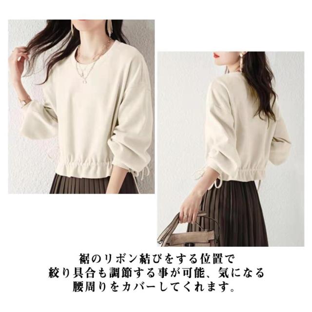 フリルショート丈トレーナー ボリュームスリー ブライトスウェット プルオーバー トップス ペプラム 無地 長袖 プルオーバー レイヤード ぽわん袖 20代 30代 40代 50代 長袖 着回し スエット シンプル 薄手 大人 きれいめ 秋