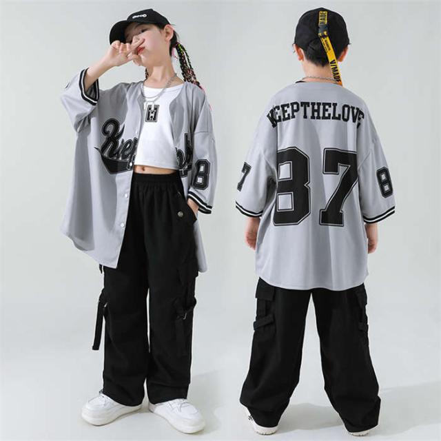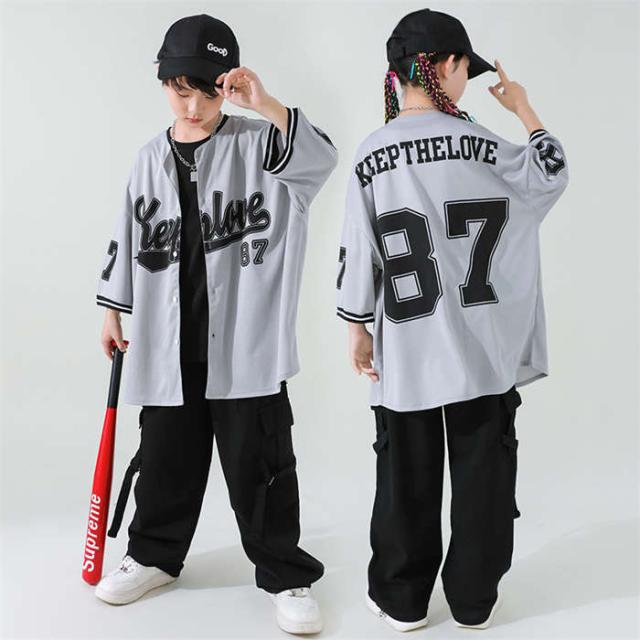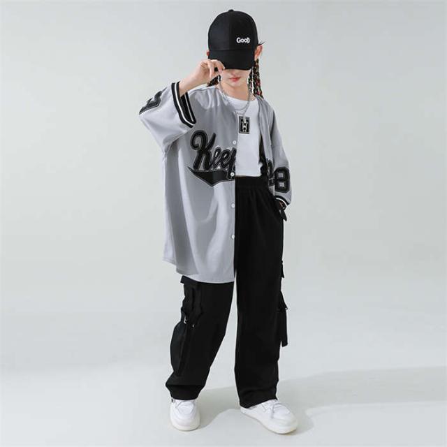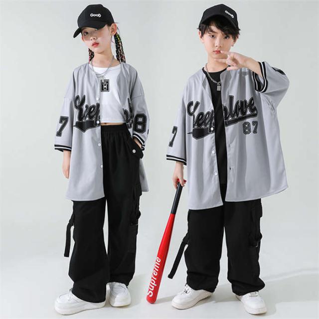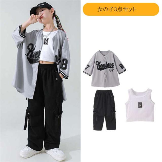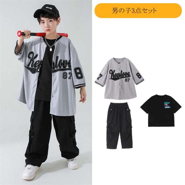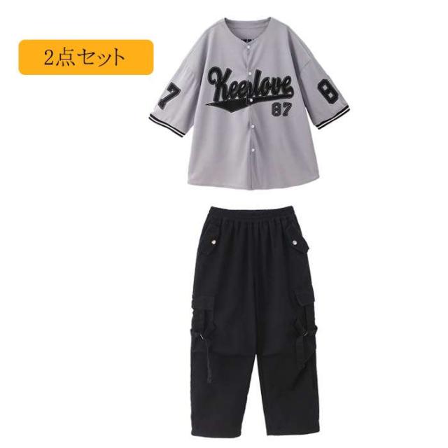 商品名:ダンス服 男女兼用 ダンスウェア ベースボールシャツキッズ ダンス衣装 女の子 男の子 ヒップホップ HIPHOP jazz ジャズダンス ロックダンス ステージ衣装 団体服 演出服 派手 半袖シャツ セットアップ カーゴパンツ 英字柄 韓国風子供服 原宿 練習着 応援団 イベント衣装 踊り舞台衣装 110cm 120cm 130cm 140cm 150cm 160cm 170cm 180cm