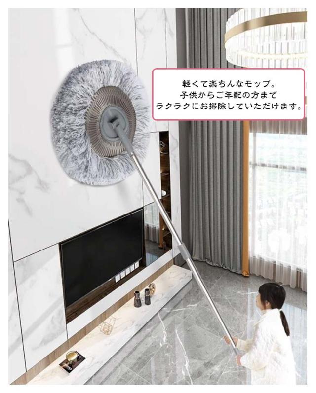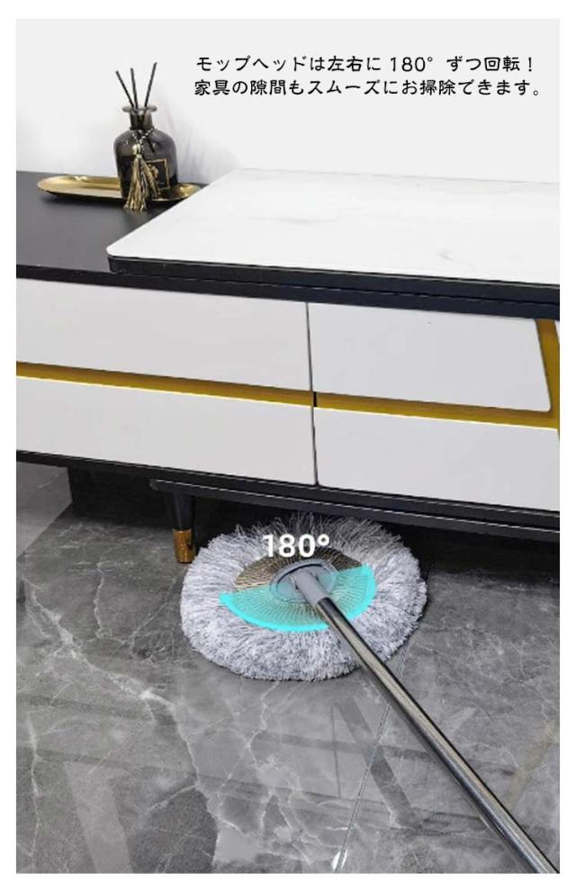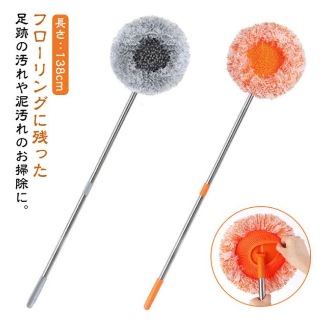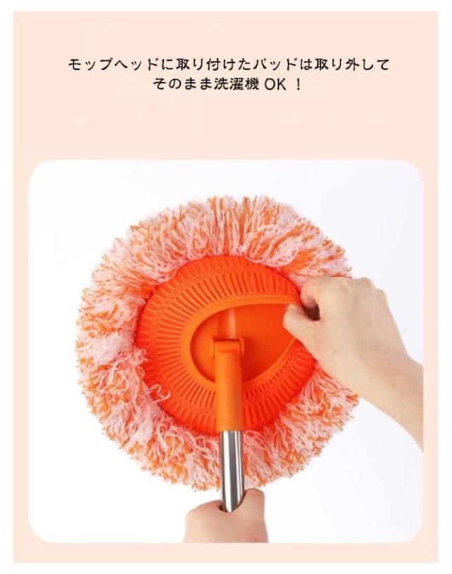 | フローリングに残った足跡の汚れや泥汚れのお掃除に。 モップヘッドは左右に180°ずつ回転!家具の隙間もスムーズにお掃除できます。 モップヘッドに取り付けたパッドは取り外してそのまま洗濯機OK! 軽くて楽ちんなモップ。子供からご年配の方までラクラクにお掃除していただけます。 | |