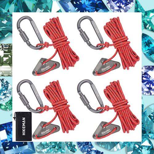 ?【セット内容】4mm * 4mのロープ ×4本、アルミニウム製自在金具x4個、カラビナx4個、黒い収納袋x1個。ロープの内側がナイロン、外側がポリエステル。自在金具はアルミニウム。重さ:0.3kg、耐荷重:350kg