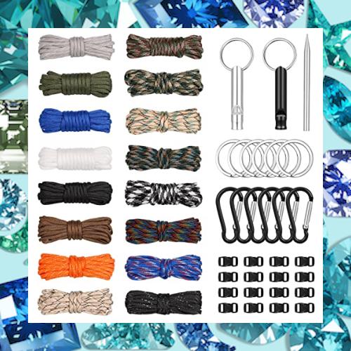 【セット内容】7芯4mm×3mロープ×16(16色)、ベルトバックル×16、キーホルダー×6、カラビナ×6、ホイッスル×2、編み針×1、素材:ポリエステル、ナイロン、耐荷重:約140-260kg本ロープは中に空洞ができないように、表地は若干タイトめに作られております。