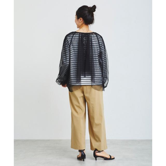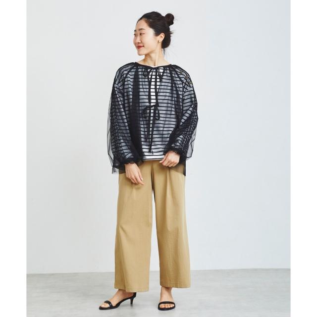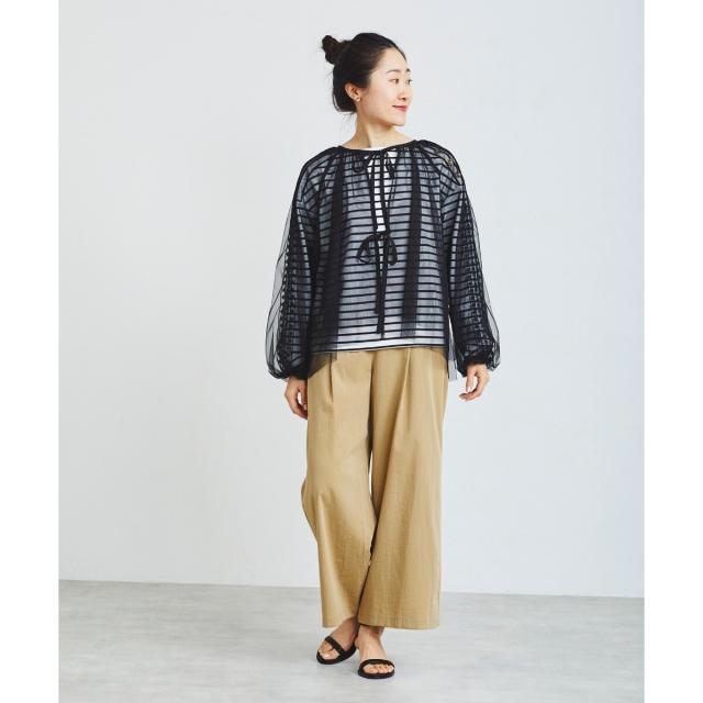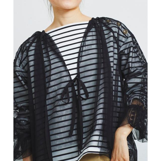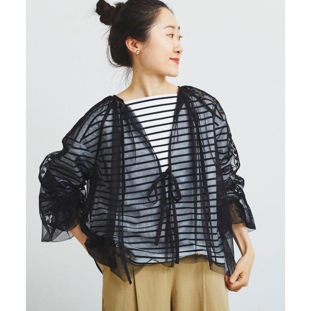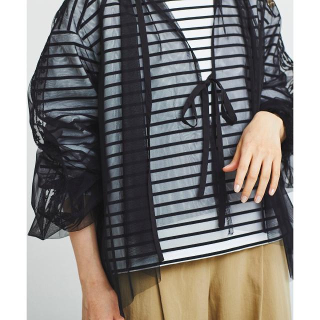 前後2wayの仕様になっており、リボンを前にすると羽織としてもお召し頂けます。インナーは、同系色を合わせて頂くと、馴染みのよいコーディネートになります。透け感を活かして、Tシャツなどに羽織るのもオシャレな着こなしになります。