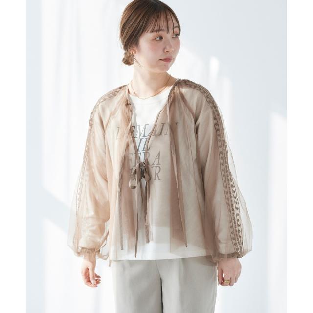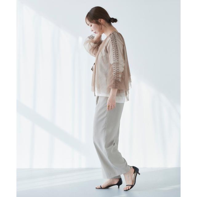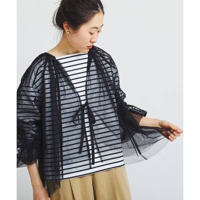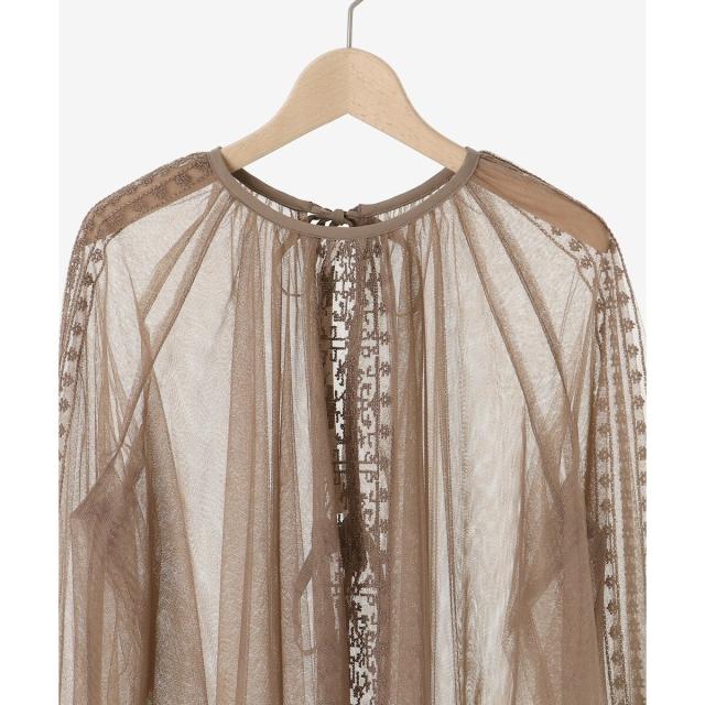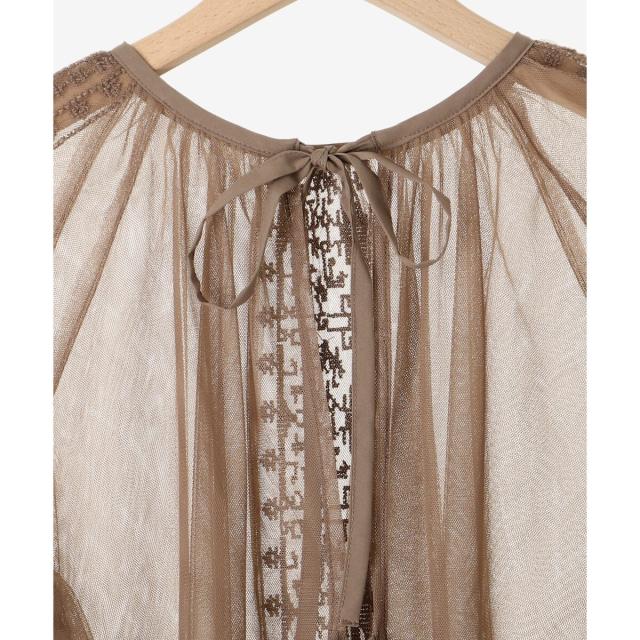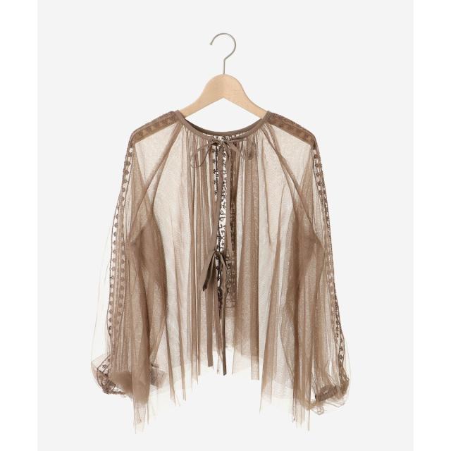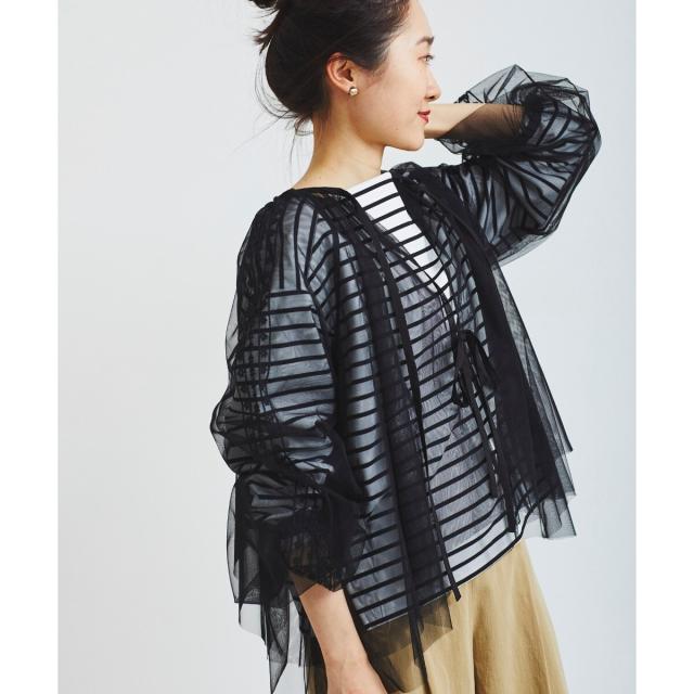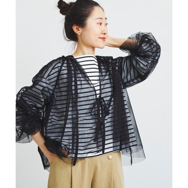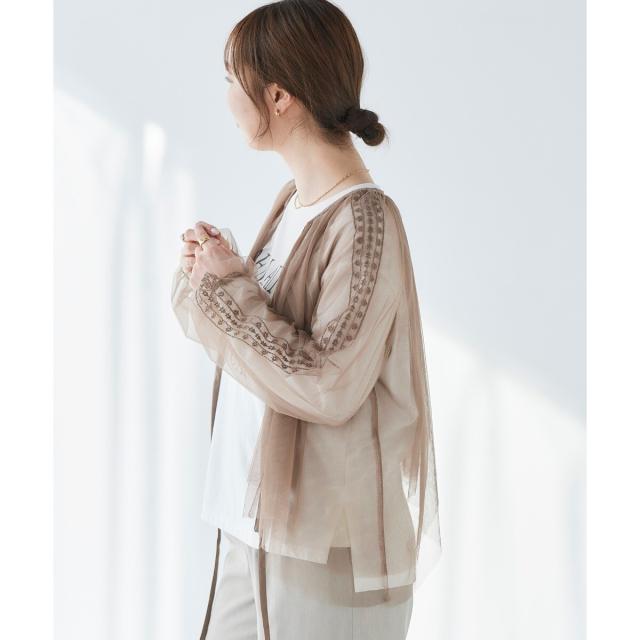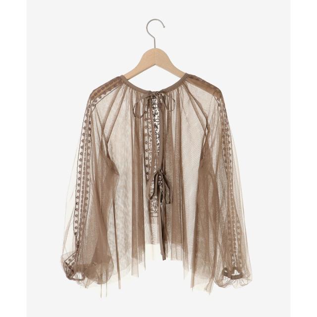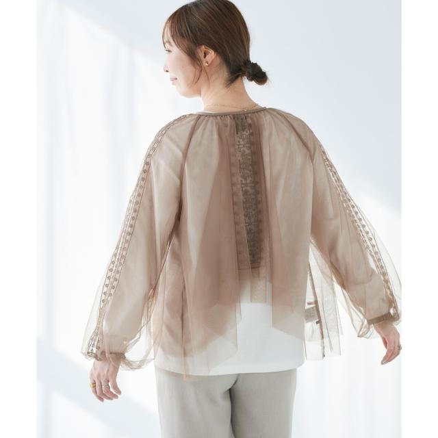 柔らかく目が細かいチュールなので袖口はバルーンスリーブも広がりすぎず上品な印象。細やかな刺繍が施された繊細なデザインと、ふんわりとしたシアー素材が女性らしさを引き立てます。