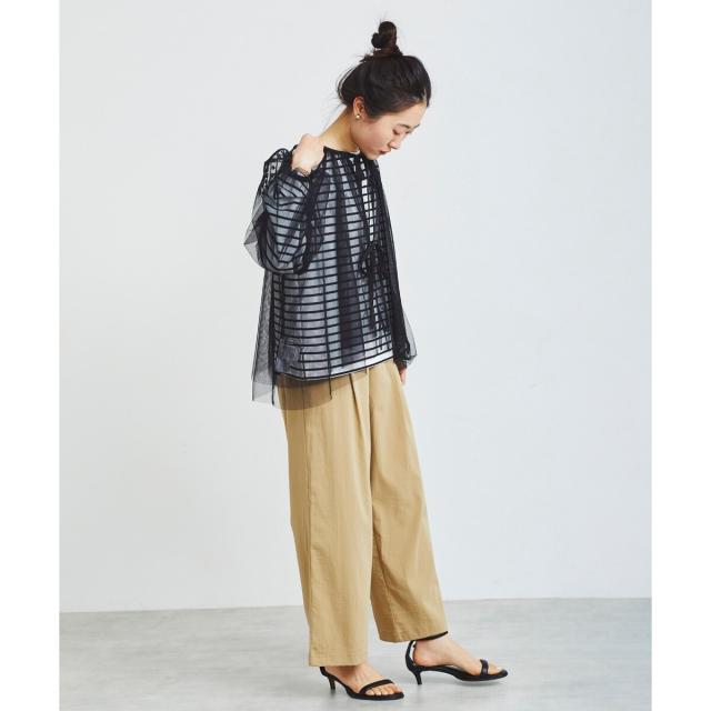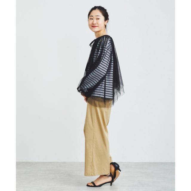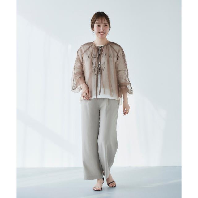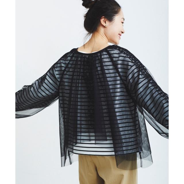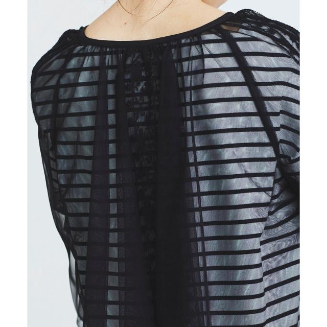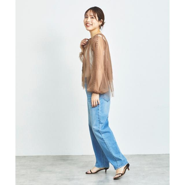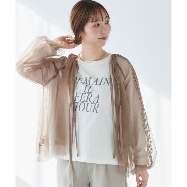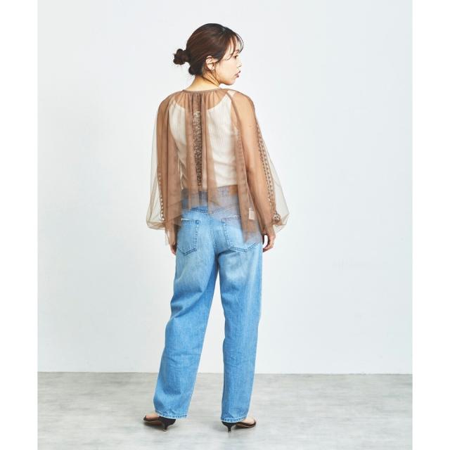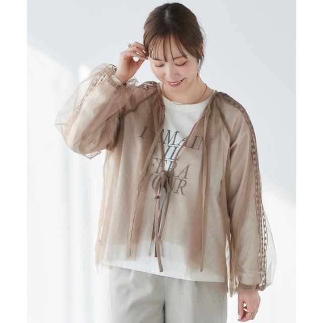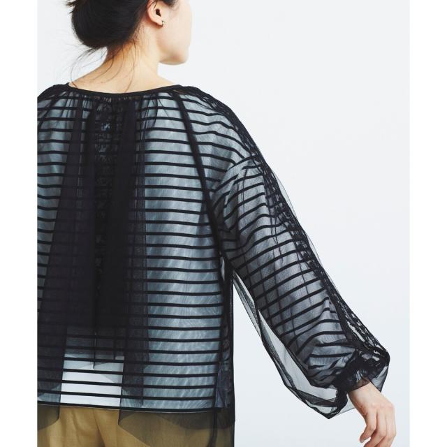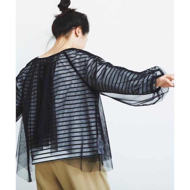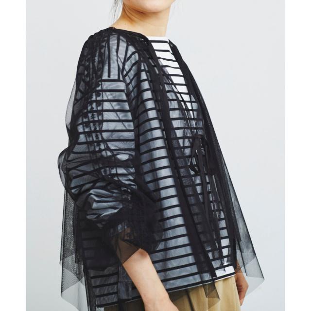 柔らかく目が細かいチュールなので袖口はバルーンスリーブも広がりすぎず上品な印象。細やかな刺繍が施された繊細なデザインと、ふんわりとしたシアー素材が女性らしさを引き立てます。