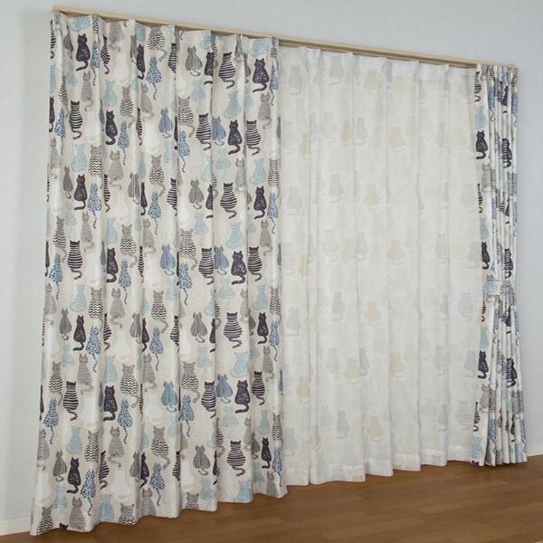 商品仕様: カーテン 4枚セット 約幅100×長さ135cm 猫柄 ドレープ・レース×各2枚 洗える タッセル付き 形状記憶 にゃかよし ブルー 青