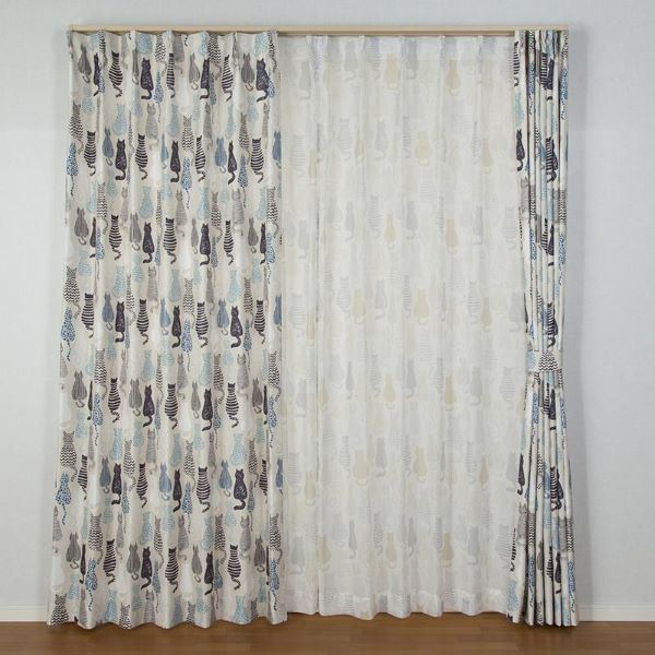 風合い軽やかな猫柄カーテン4枚セット 洗える ウォッシャブル ドレープ・レースでお部屋を彩る タッセル付きでおしゃれ度UP 形状記憶でいつも美しいシルエットをキープ 幅100×長さ200cmの非遮光タイプで快適な空間を演出 にゃかよしブルーで癒しのひとときを 青 カーテン 4枚セット 約幅100×長さ200cm 猫柄 ドレープ・レース×各2枚 洗える ウォッシャブル タッセル付き 形状記憶 にゃかよし ブルー 青