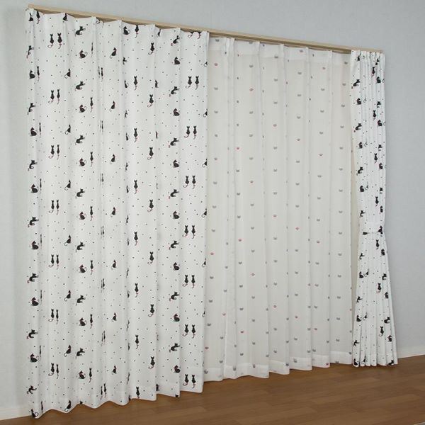 ■ドレープ・レースカーテン×各2 計4枚セット 約幅100cm×長さ200cm にゃーとニャン ミックス
