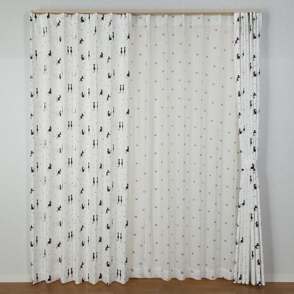 風合い軽やかな猫柄カーテン4枚セット 洗える ウォッシャブル タッセル付きでお手入れ簡単 幅100×長さ178cmのインテリア雑貨、形状記憶でいつも美しいシルエットをキープ にゃーとニャンの愛らしいデザインでお部屋を華やかに彩る カーテン 4枚セット 約幅100×長さ178cm 猫柄 ドレープ・レース×各2枚 洗える ウォッシャブル タッセル付き 形状記憶 にゃーとニャン ミックス