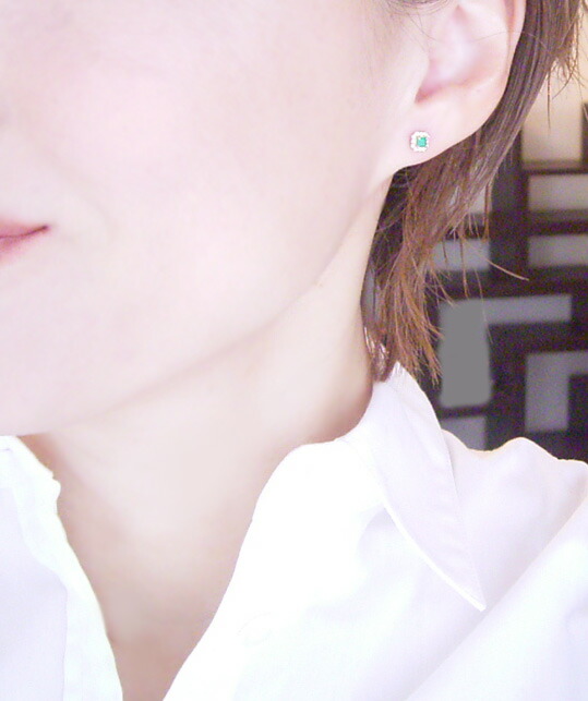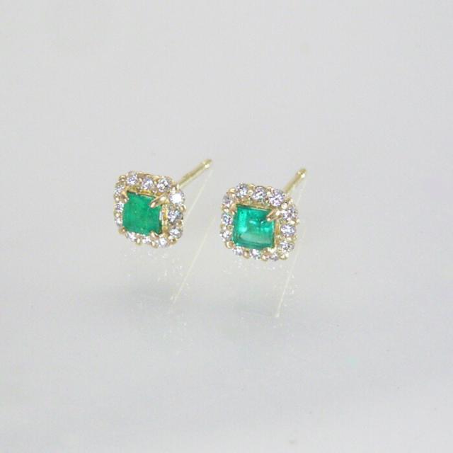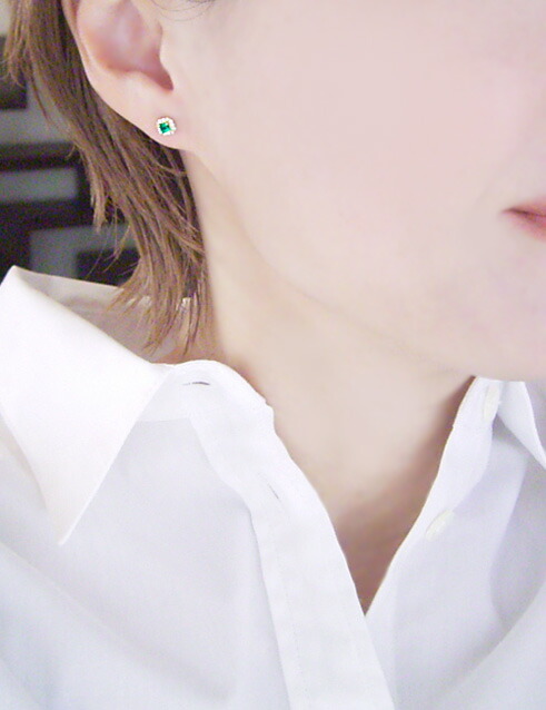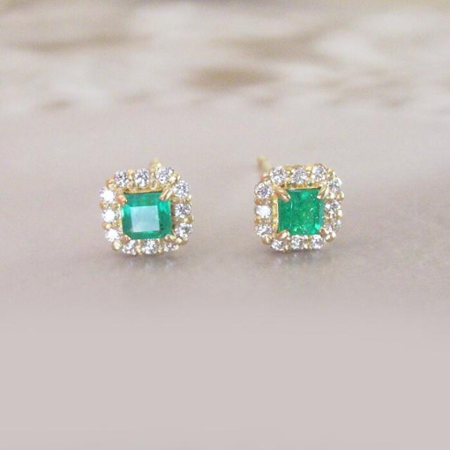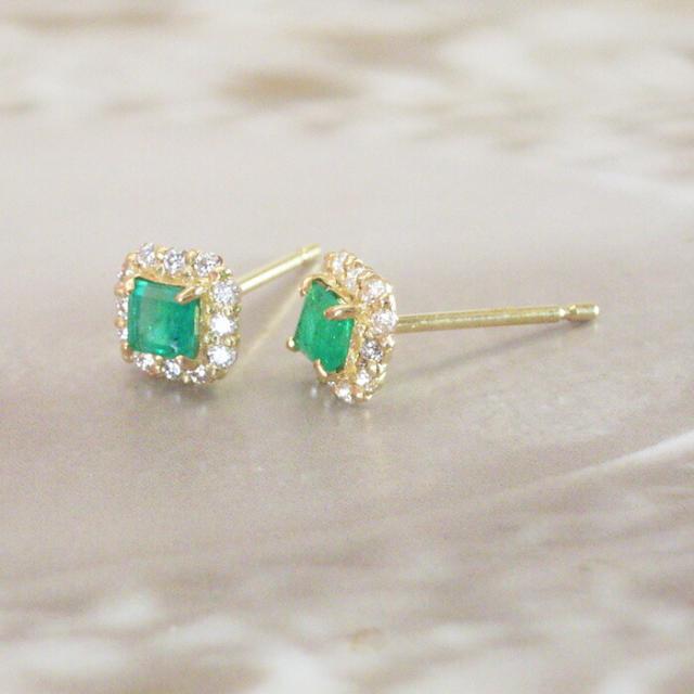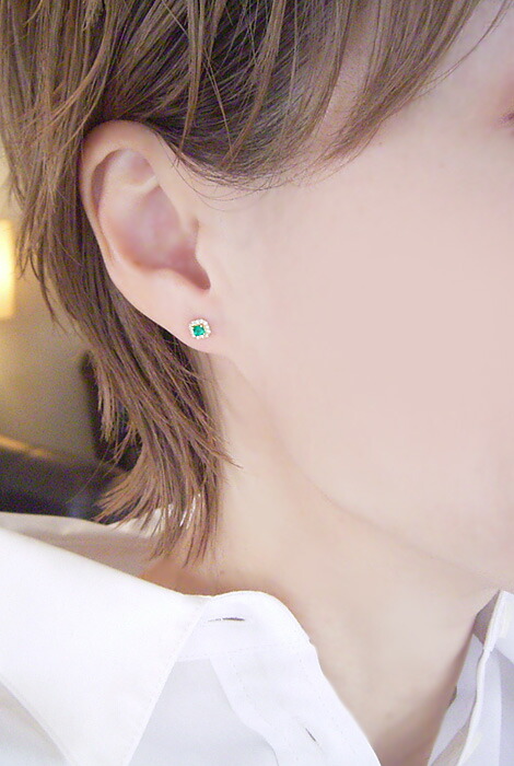 透明感あふれる美しいエメラルドをダイヤモンドが取り巻く存在感抜群のピアスをお届け致します。