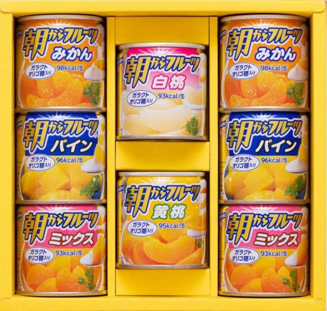 商品内容:朝からフルーツパイン190g×2、朝からフルーツミックス190g×2、朝からフルーツ白桃190g×2、朝からフルーツ黄桃190g×1、朝からフルーツみかん190g×2
