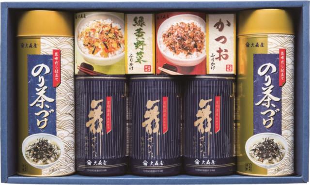 商品内容:味付のり(10切40枚)3個/緑黄野菜ふりかけ(2.5g×10袋)/かつおふりかけ(2.5g×10袋)/のり茶漬(5.4g×8袋)2缶